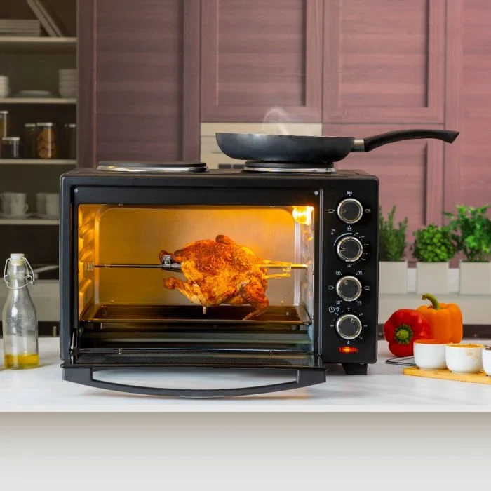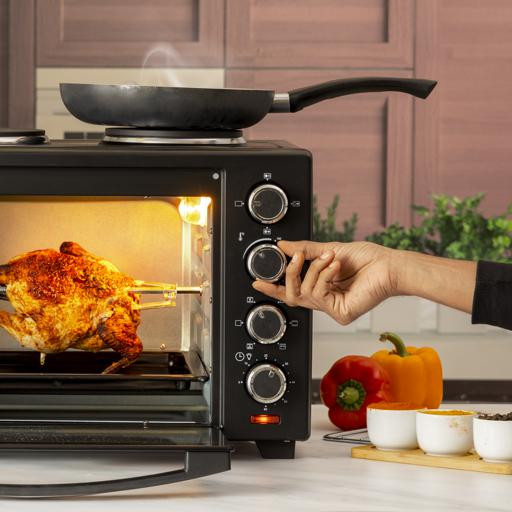 The Geepas GO34052 Electric Oven with Dual Hot Plate is a versatile kitchen tool that can help you cook, bake, and grill with ease. It has a 38-liter capacity and 1600 watts of power, making it fast and efficient for all your cooking needs. The top has two hot plates that let you fry or boil food at the same time while the oven is on. The convection function helps spread heat evenly for great baking results, and the rotisserie feature ensures your meats and poultry are cooked evenly. This oven is built to last and is compact, making it perfect for small kitchens.