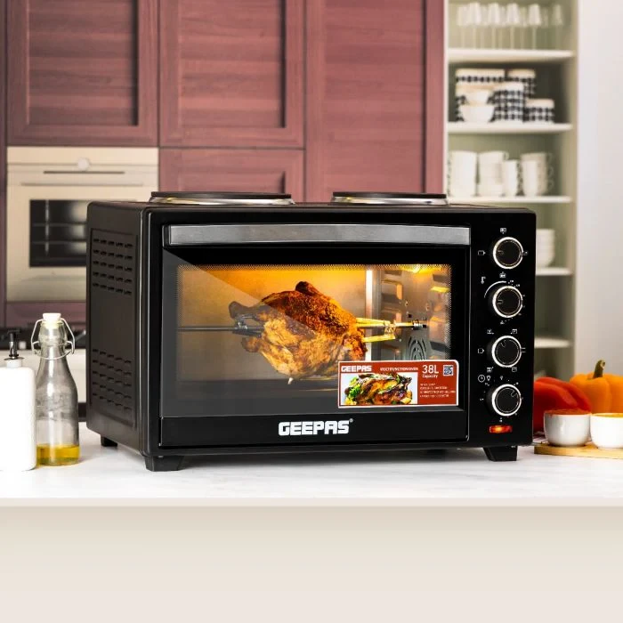 • 38-liter capacity great for families and everyday use• 1600 watts of power for fast and even heating• Dual hot plates for cooking and heating at the same time• Convection function for even heat distribution for perfect baking• Rotisserie function to cook chicken, kebabs, and meat evenly• Adjustable temperature control for better cooking results• Multi-functional for baking, grilling, roasting, and toasting• 60-minute timer with a bell to let you know when it's done• Clear window to check on your food while it cooks• Strong stainless steel body that’s easy to cleanSpecifications:• Brand: Geepas• Model: GO34052• Type: Electric Oven with Dual Hot Plate• Capacity: 38L• Power: 1600W• Functions: Bake, Grill, Roast, Toast, Rotisserie, Convection• Hot Plates: Dual (Small & Large)• Temperature Control: Adjustable• Timer: 60 Minutes with Bell Alert• Body Material: Stainless Steel• Door Type: Transparent Glass Door• Accessories: Baking Tray, Grill Rack, Rotisserie Set• Color: Silver/Black• Installation: Countertop
