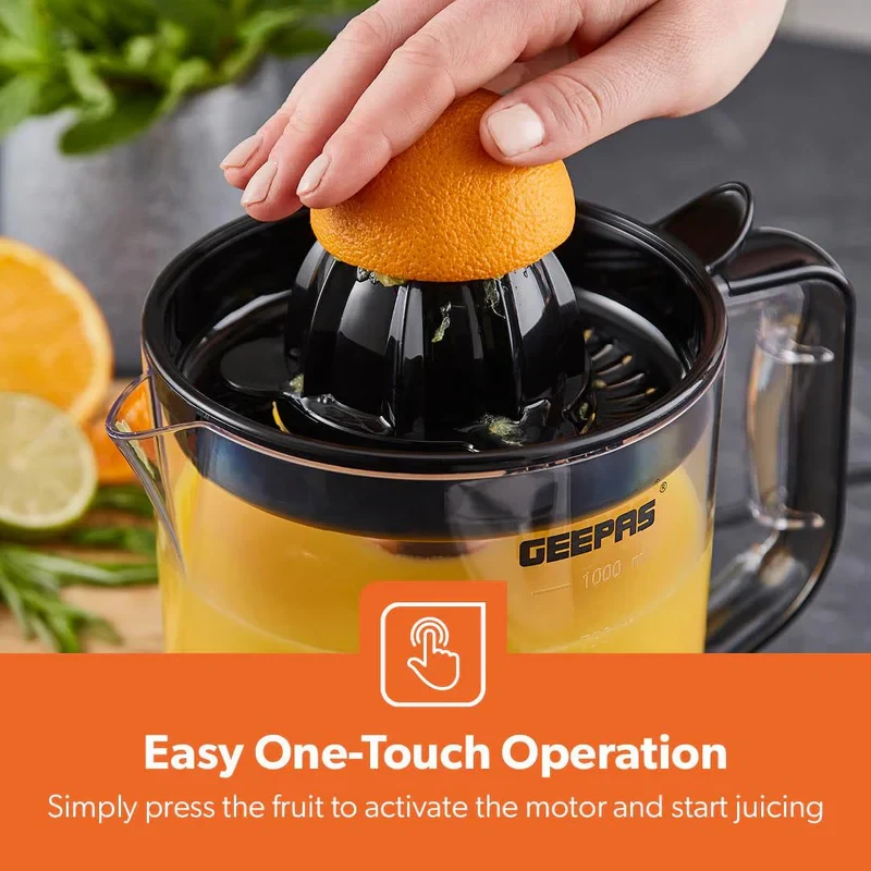 The Geepas GCJ9900 Citrus Juicer is a dependable and effective kitchen tool made to get the most juice out of your preferred citrus fruits. It comes equipped with a robust 25W copper motor and a two-way rotation system, which helps in extracting juice thoroughly from oranges, lemons, limes, and grapefruits. The 1.0-liter large container allows you to make several servings at the same time, making it an excellent choice for households. The transparent body lets you easily watch the juicing process in action, and the easy-pour spout along with detachable components make cleaning a breeze. This juicer is compact, built to last, and straightforward to use, bringing a fresh touch to your kitchen every day.