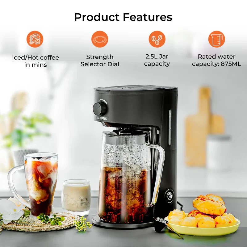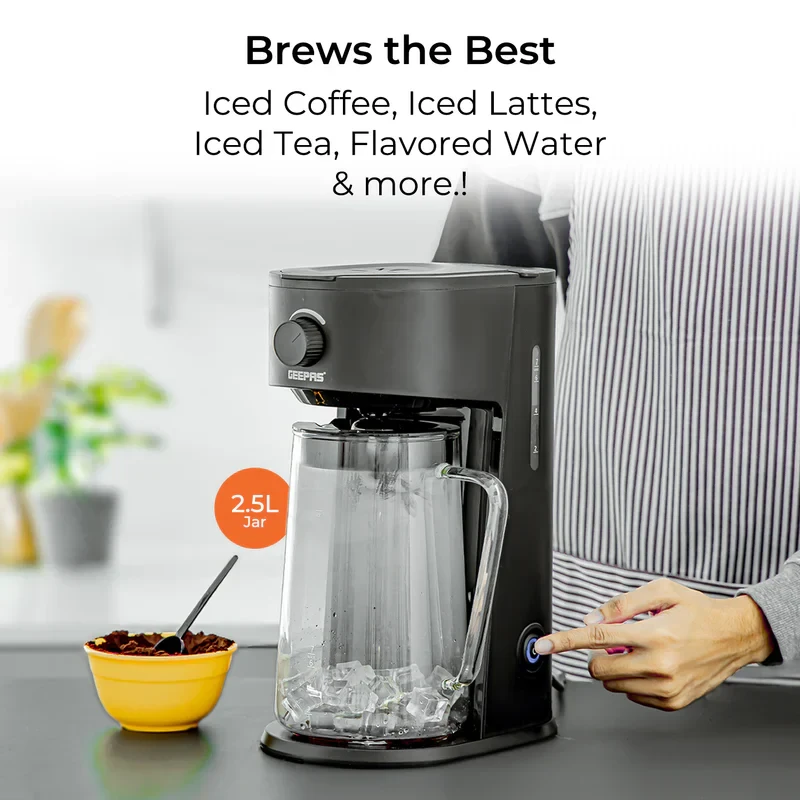The Geepas GCM41516 Ice Tea & Coffee Maker is a versatile and efficient appliance that makes it easy to prepare refreshing iced tea or rich coffee. It comes with a 2.5L jar and an 875ml water tank, allowing you to make multiple servings all at once. The 700W motor ensures that brewing is done quickly and consistently, and the adjustable brew strength control lets you tailor the flavor to your taste. With features like auto power-off, a durable nylon filter, and an easy-to-clean design, this coffee and tea maker offers convenience, performance, and long-lasting durability for daily use.