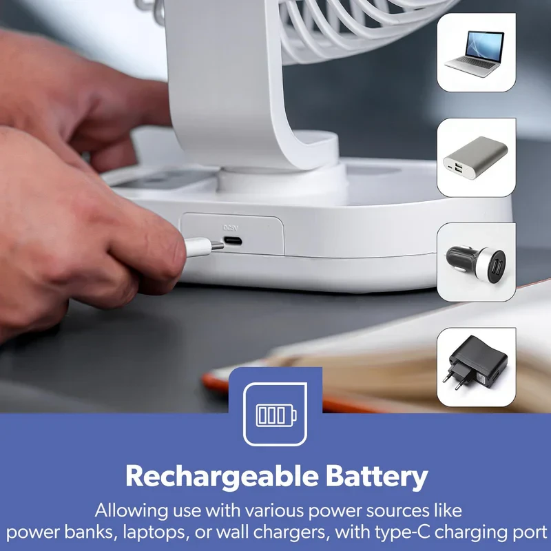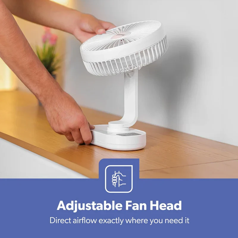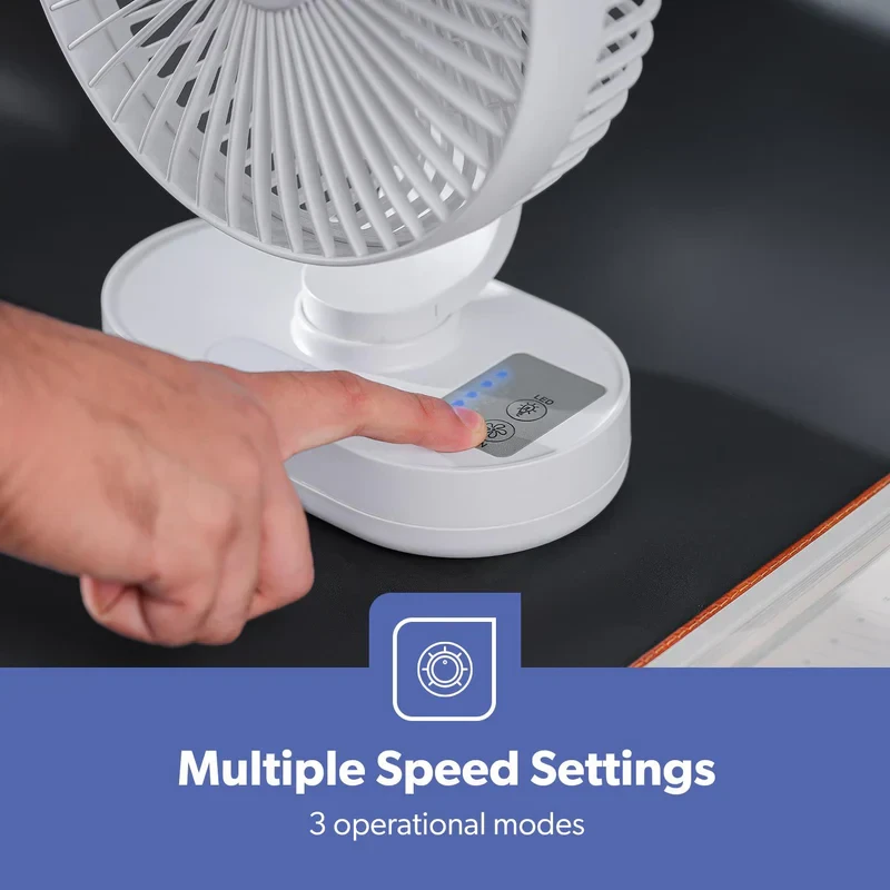 The Geepas GF21157 8-Inch Rechargeable Fan is a small and useful fan that helps cool down spaces at home, work, or while traveling. It comes with a long-lasting lithium battery that can run for up to 9 hours straight. The fan has three different speed levels, so you can choose how much airflow you need. It also has three blades that help move air efficiently, and there's a built-in LED light that can be used as a night light. The fan’s head can be adjusted, allowing you to aim the airflow where you need it most, making it great for cooling yourself in any environment.
