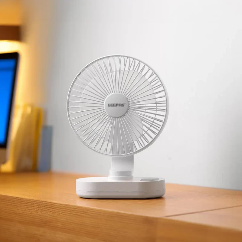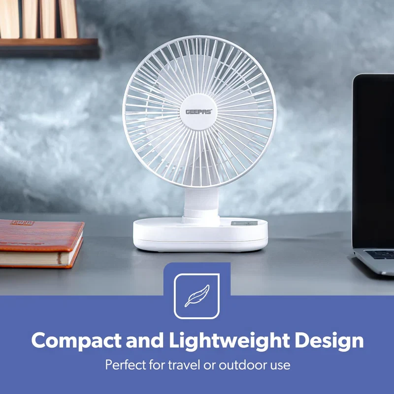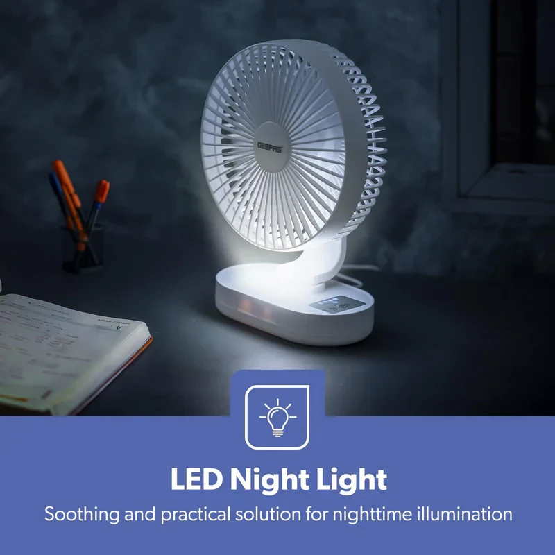 • 8-inch fan that is rechargeable and easy to carry around• Three speed options for controlling the amount of airflow• Up to 9 hours of use on a single charge thanks to the efficient lithium battery• Includes a built-in LED light that can be used in low-light situations• Three blades designed for good airflow and effective cooling• Adjustable head for directing the air exactly where you want it• Small and lightweight, making it simple to take with you wherever you go• Perfect for use at home, in the office, while traveling, or by the bedsideSpecifications:• Brand: Geepas• Model: GF21157• Type: Rechargeable Fan• Size: 8 Inch• Battery Type: Lithium Battery• Runtime: Up to 9 Hours• Speed Settings: 3• LED Light: Built-in Night Light• Fan Blades: 3• Adjustable Head: Yes• Operation: Portable and quiet• Suitable For: Home, Office, Travel