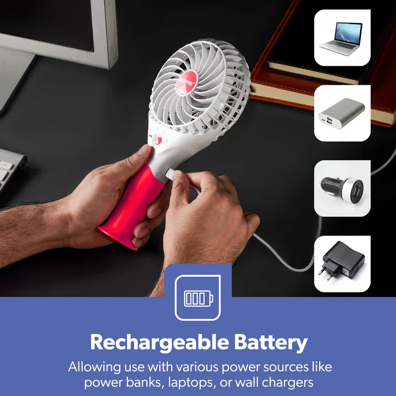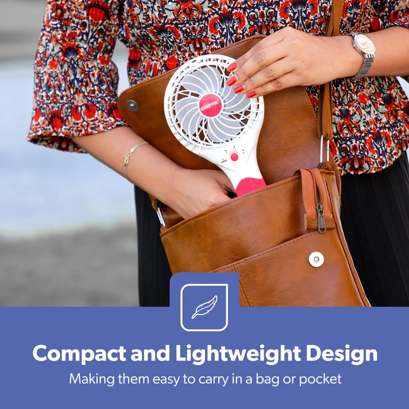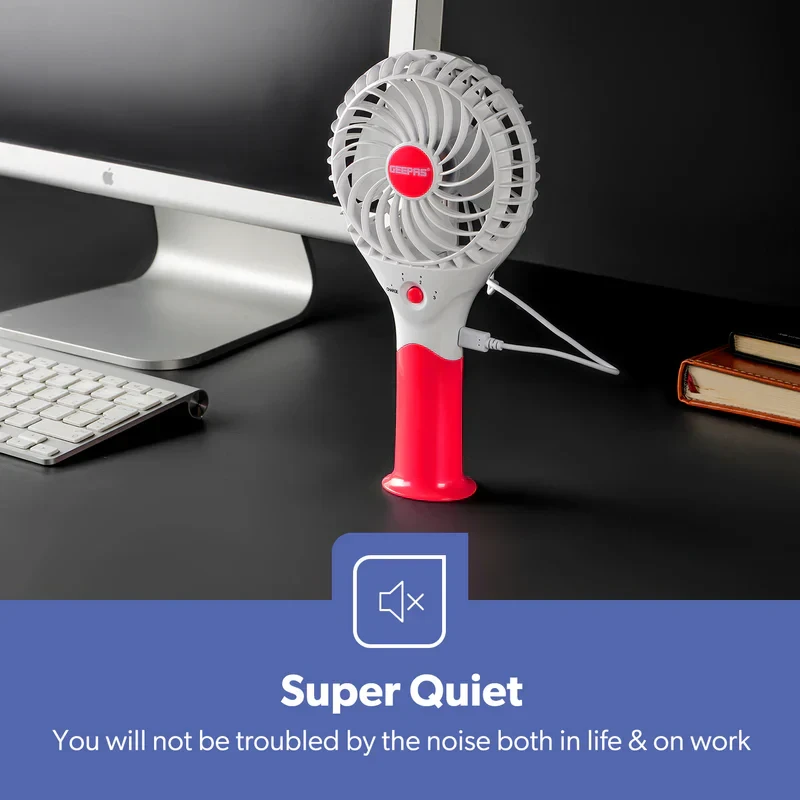 The Geepas GF9617 Rechargeable Mini Fan is a small and easy-to-carry fan that helps keep you cool in different places like your home, office, while traveling, or outdoors. It uses a 3.7V lithium battery and can be charged via USB, making it easy to use without needing a power cord. This fan has 3 different speed settings so you can choose the airflow that works best for you. It also has a brushless motor that runs smoothly and lasts longer, and it operates quietly so it doesn't interrupt your work or rest. The fan is light and designed to be held in your hand, making it simple to take with you anywhere.