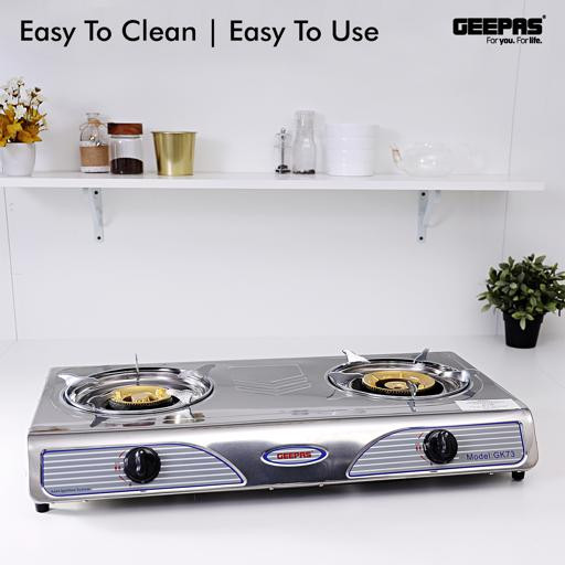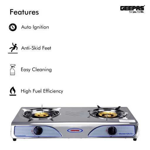 The Geepas GK73 Stainless Steel Gas Stove is made to last and work well. It has a strong 7kW double burner setup that heats up quickly and spreads heat evenly for better cooking. The auto ignition system makes it easy to light without needing matches. The stove is built from sturdy stainless steel, which helps it stay rust-free and looks clean and modern. Itβs great for everyday use at home, combining efficient cooking, safety, and ease of use in a compact design.