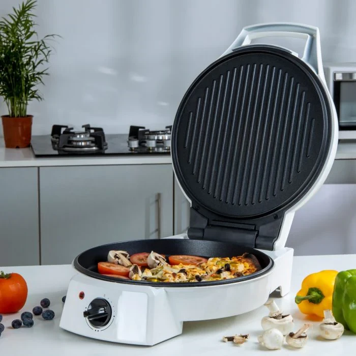 The Geepas GPM2035 Pizza Maker is made to bring restaurant-style pizzas into your home kitchen. It uses a strong 1800W heating system and a big 32cm non-stick baking plate to make pizzas that are evenly cooked and crispy every time. The double-sided heating helps cook food evenly from top to bottom, and the temperature settings let you adjust the heat for different kinds of food. This handy appliance can also be used as a grill, making it great for making sandwiches, flatbreads, omelettes, and more. Its small size and strong build make it perfect for making quick and easy meals in any kitchen.