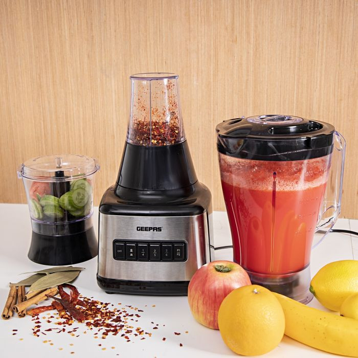 The Geepas GSB44017 3-in-1 Stainless Steel Blender brings together strength, accuracy, and flexibility to make cooking and preparing food much easier. It has a 500W strong motor that helps blend smoothies, shakes, and purees quickly and smoothly. The blender comes with a 1.5L strong plastic jar perfect for making meals for the whole family. It also features 4 sharp stainless steel blades that work quickly and evenly. The blender has 8 speed levels and 2 preset modes, letting you choose the right setting for each type of food. Its anti-slip feet keep it steady while it's running, making it a dependable tool in your kitchen.