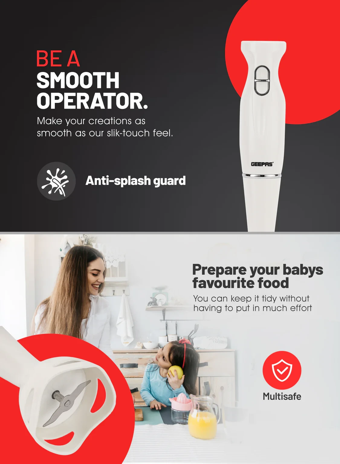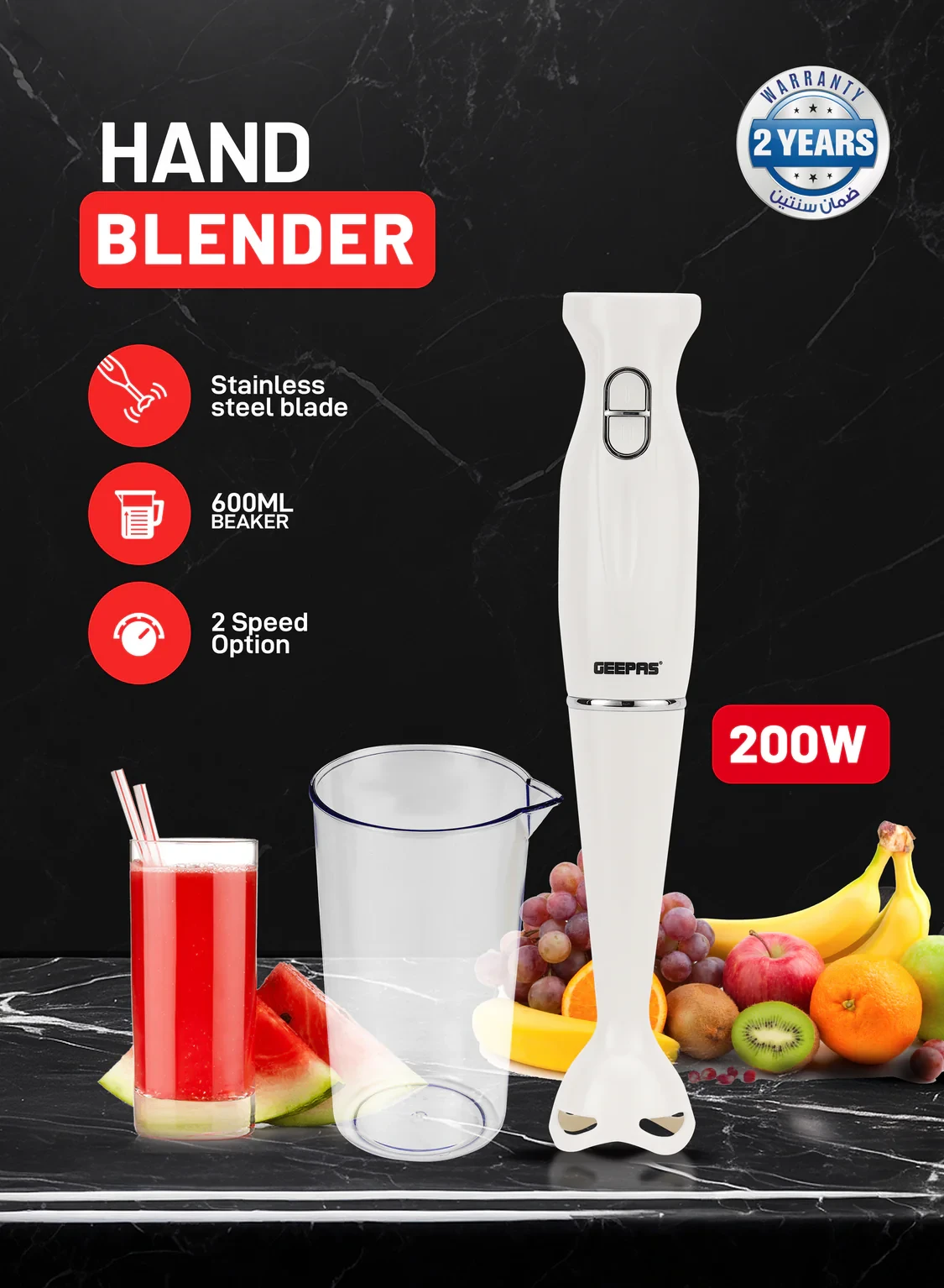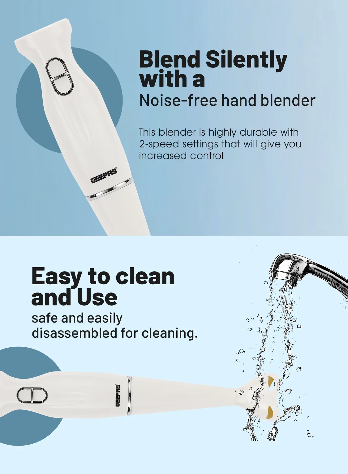 - A 200W motor that makes blending and mixing simple- Two speed settings for different blending needs- Stainless steel blade for smooth and even results- Ergonomic handle for a comfortable and firm grip- Comes with a 600ml beaker for easy measuring and blending- Small, light, and easy to use- Detachable blending stick for easy cleaning- Great for making soups, sauces, smoothies, and baby foodSpecifications:- Brand: Geepas- Model: GHB6143- Power: 200W- Speed Control: Two-speed settings- Blade Material: Stainless steel- Beaker Capacity: 600ml- Body Material: Durable plastic with stainless steel stick- Functions: Blending, mixing, pureeing- Cleaning: Detachable stick for easy cleaning- Design: Ergonomic and lightweight- Color: Usually white or silver- Suitable For: Everyday kitchen use, soups, sauces, smoothies