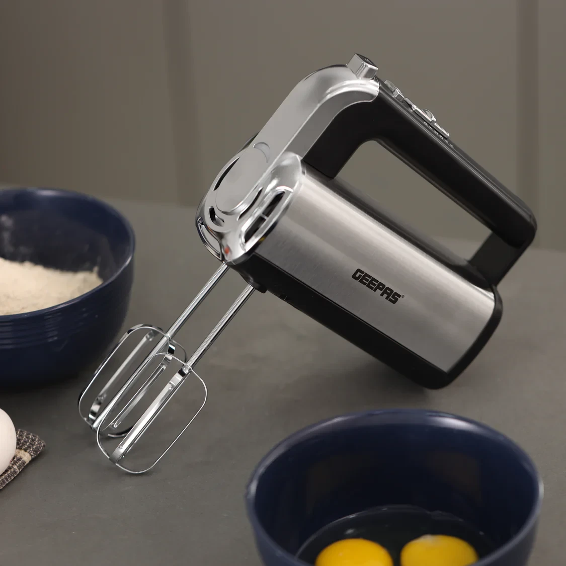 The Geepas GHM2001 Hand Mixer is a strong and efficient tool that makes mixing, whipping, and beating ingredients much easier in the kitchen. It has a solid 400W motor and five speed settings, allowing you to work with different types of ingredients, like light batters or thick dough. There's also a turbo function that gives an extra boost of power when you need it. The beaters are made of stainless steel, which means they are tough and work smoothly. The mixer is light and has an ergonomic shape, so it's comfortable to hold and use. The beaters can be easily removed, making cleaning simple and quick. This mixer is great for people who enjoy baking or cooking at home.