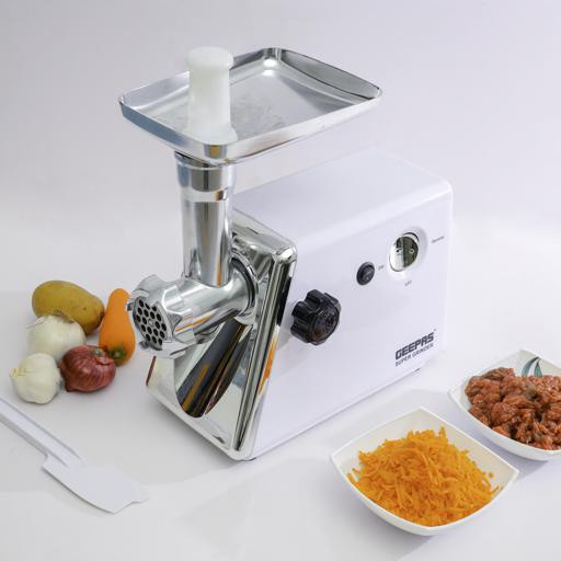 • A powerful 1500W motor for fast and effective grinding of meat and other foods• Reverse function to stop the machine from jamming• Three metal cutting blades for different grinding settings: fine, medium, and coarse• Meat mincer and sausage grinder functions for multiple uses• Attachments for grating vegetables and using a grater for extra versatility• Compact, sturdy, and easy to clean• Safe and simple to use• Perfect for home kitchens and various food preparation tasksSpecifications:• Brand: Geepas• Type: 8-in-1 Electric Meat Grinder• Power: 1500W• Material: Metal cutting blades and plastic body• Cutting Plates: 3 metal plates• Attachments: Meat mincer, sausage grinder, vegetable and grater tools• Safety Features: Reverse function, stable base• Handle/Grip: Comfortable and durable• Color: Silver and black• Suitable For: Grinding meat, making sausages, mincing, and vegetable grating