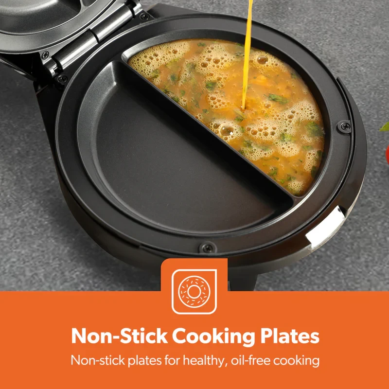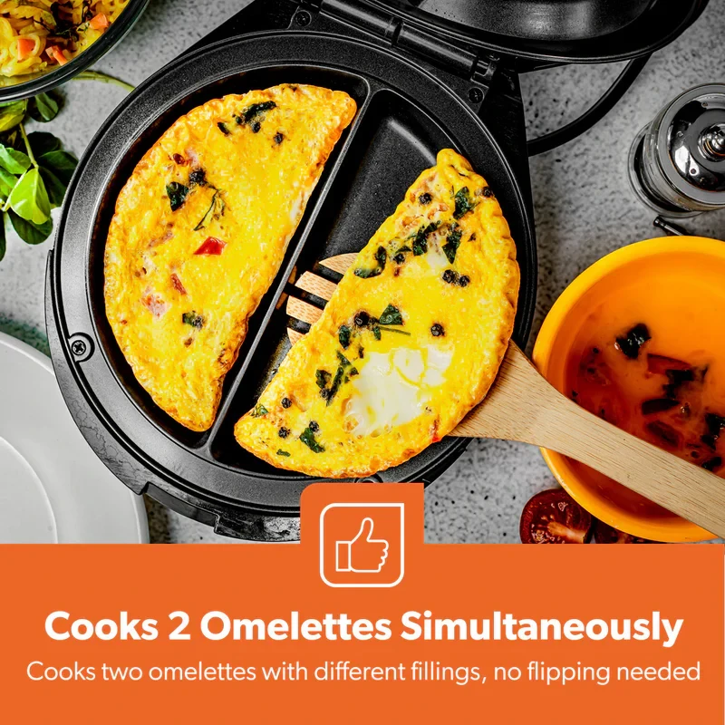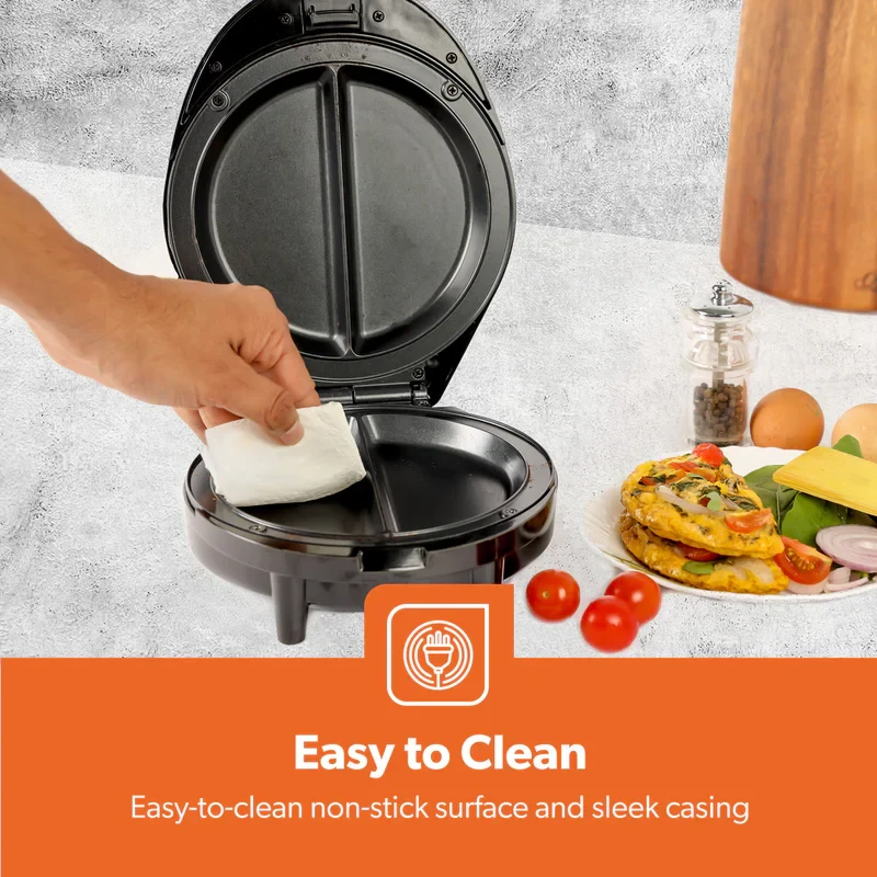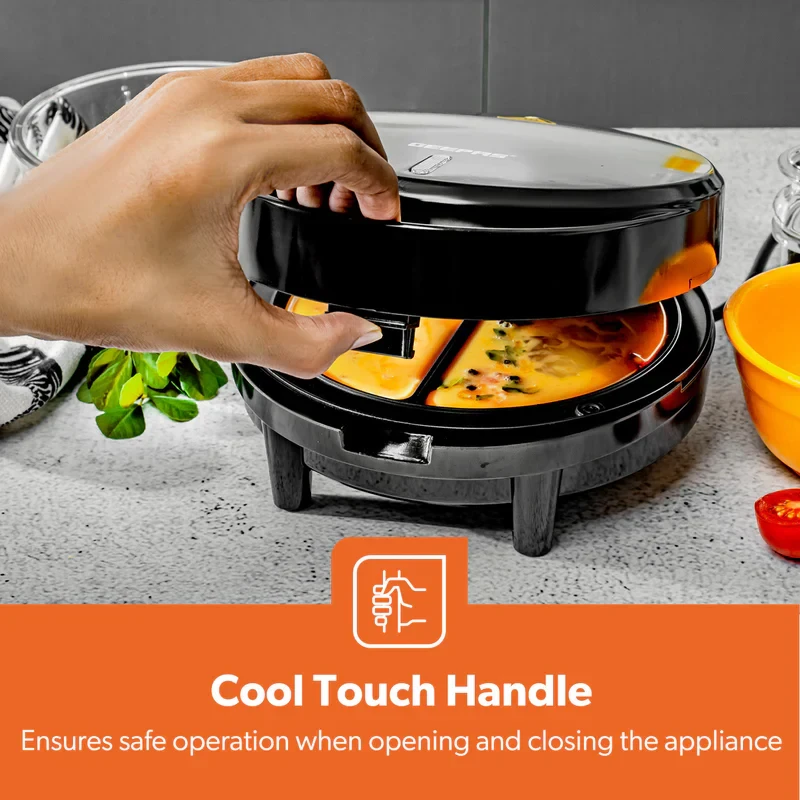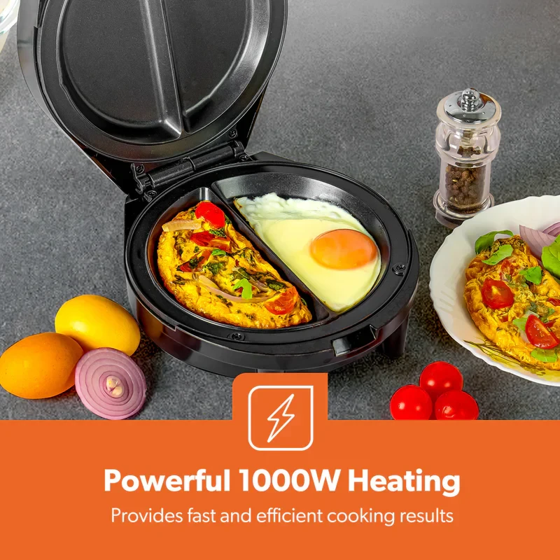 The Geepas GOM36535UK Omelette Maker is made to help you make light, fluffy, and cooked-through omelettes every time. It has a strong 1000W heating system and a non-stick 185mm cooking plate, so you can cook tasty omelettes, pancakes, or filled egg dishes quickly without them sticking or burning. The automatic temperature control helps keep the cooking even, and the green and red lights make it easy to know when it's ready. The anti-slip feet keep the maker steady while you use it, and the small size makes it simple to store — making it a great addition to any kitchen.