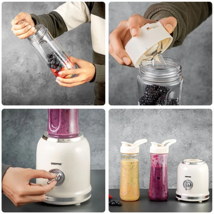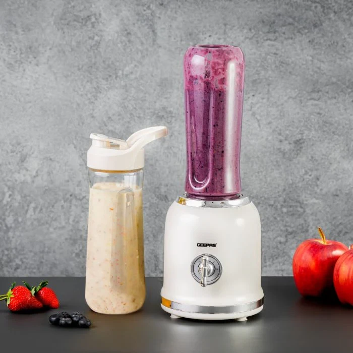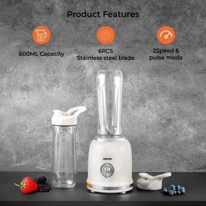 The Geepas GSB44113 Personal Blender is a small and handy tool that makes it easy to blend on the go. It has a 300W motor that works well to mix fruits, veggies, and ice into smoothies, shakes, and juices. The blender comes with two 600ML bottles made from BPA-free Tritan, which are clear, tough, and safe for everyday use. The blades are made of stainless steel, making sure your blends are smooth and consistent. The one-touch button makes it simple to use, which is great for a busy life. This blender is perfect for people who work out often or travel, offering a mix of good performance, safety, and portability.