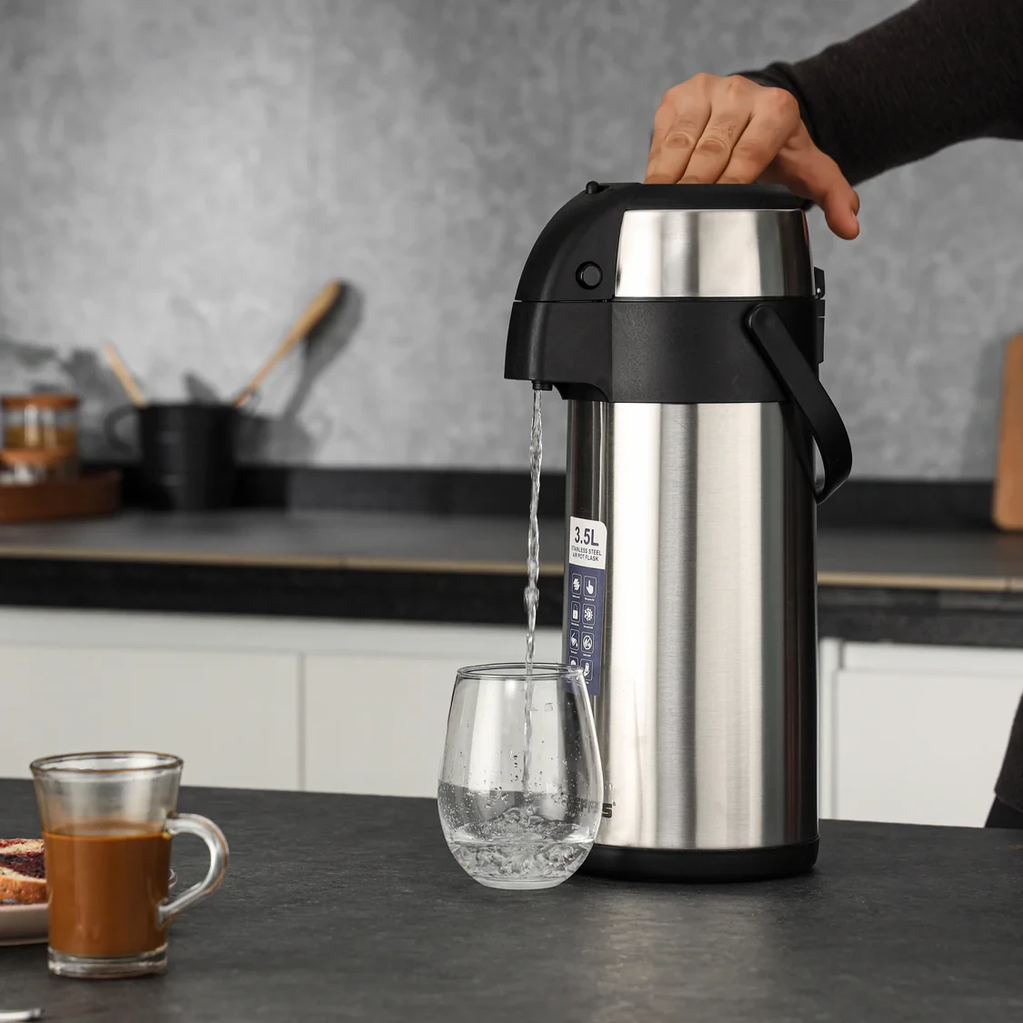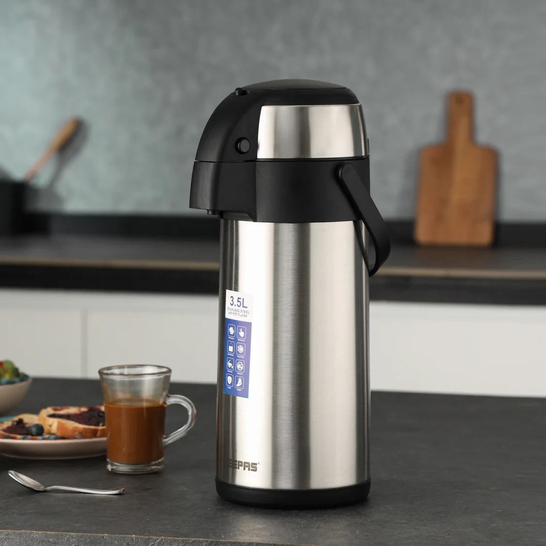 The Geepas GVF5263 Stainless Steel Air Pot Flask is a high-quality thermal flask designed to keep your drinks hot or cold for up to 24 hours. With its generous 3.5-liter capacity, it's great for family events, office use, picnics, or any gathering. The flask features double-walled vacuum insulation, which helps maintain the perfect temperature, preserving the taste and freshness of your beverages for a long time. Its sturdy stainless steel construction makes it durable for everyday use, and the air pump dispenser allows for easy pouring without having to lift the flask. Whether you're serving coffee, tea, or water, this air pot offers a blend of practicality, space, and a stylish look that works both at home and in professional settings.