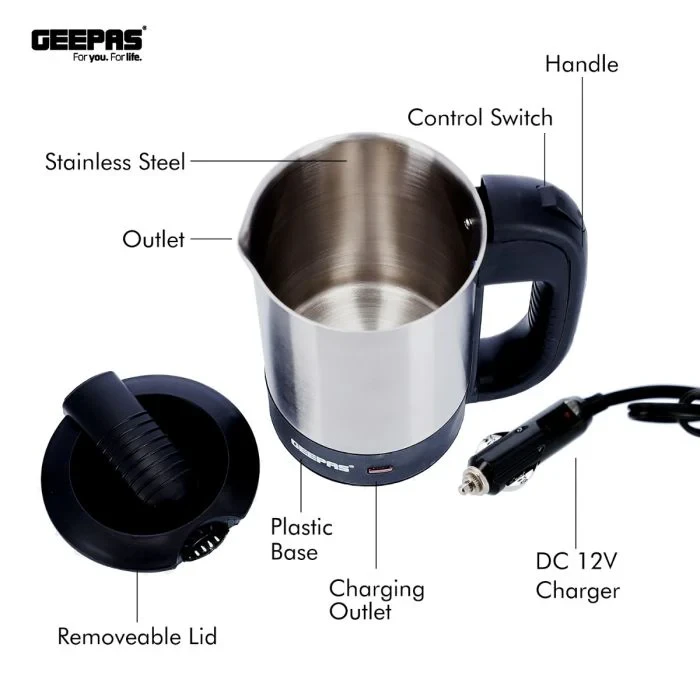 • 0.5L size that's perfect for traveling• Uses a 12V car adapter for easy heating while on the move• Made from durable stainless steel for long-lasting use• Fast boiling technology for quick hot drinks• Automatic shut-off for safety and to stop over-boiling• Boil-dry protection for added safety• Heat-resistant handle for safe and easy pouring• Small and light design for easy storage• Great for tea, coffee, and instant soups during tripsSpecifications:• Brand: Geepas• Model: GK38041• Type: Car Electric Kettle• Capacity: 0.5 Litres• Power Source: 12V Car Adapter• Material: Stainless Steel• Safety Features: Auto Shut-Off, Boil-Dry Protection• Handle: Heat-Resistant• Design: Compact, Portable & Durable• Suitable For: Car, Camping, Road Trips, Outdoor Use• Color: Silver with Black Accents• Heating Speed: Fast & Energy Efficient