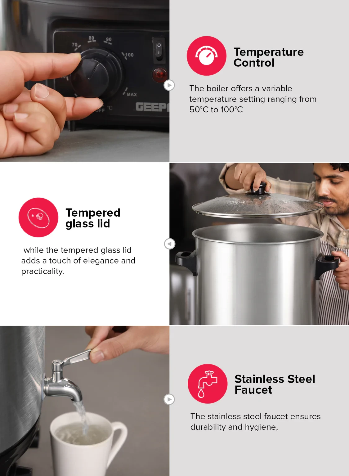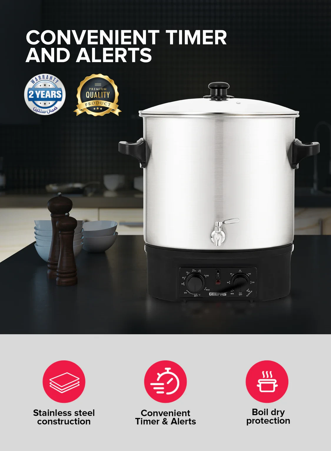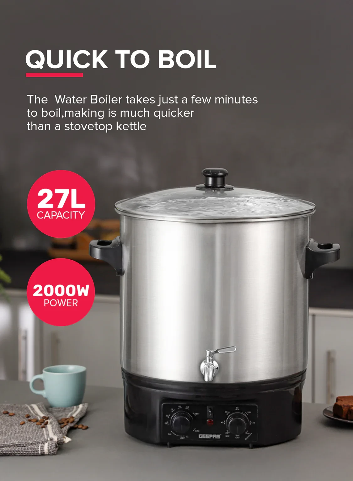 The Geepas Stainless Steel Water Boiler 27L GK38077 is built for boiling large amounts of water, making it perfect for offices, events, and other commercial settings. It features a strong 2000W heating element that heats water quickly and efficiently, helping to save energy. The boiler comes with a durable stainless steel construction that not only lasts a long time but also looks professional. It also has built-in safety features like boil-dry protection and an automatic shut-off function, ensuring safe and reliable use. The easy-to-handle design and timer feature make it simple to use, so you can always have hot water ready when you need it.