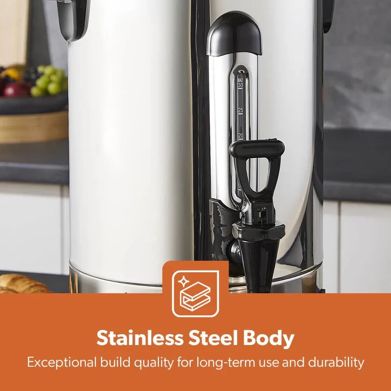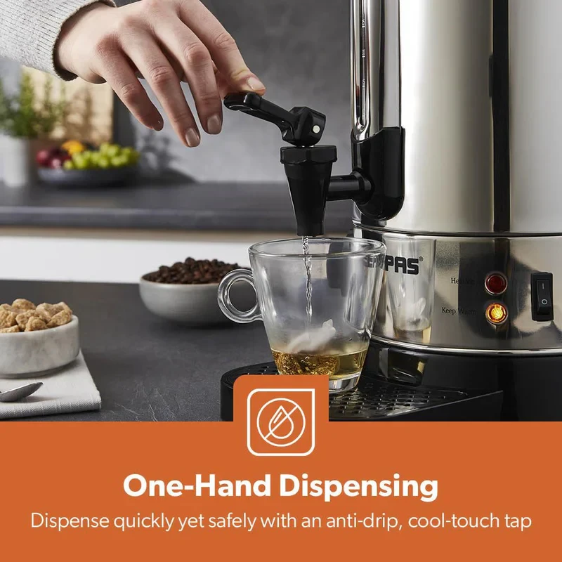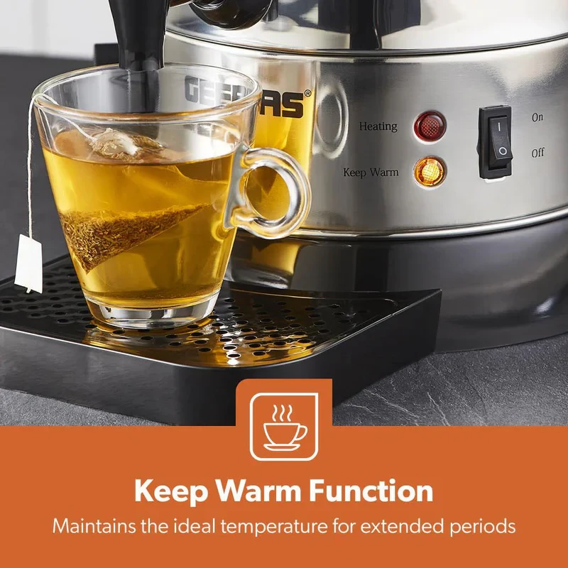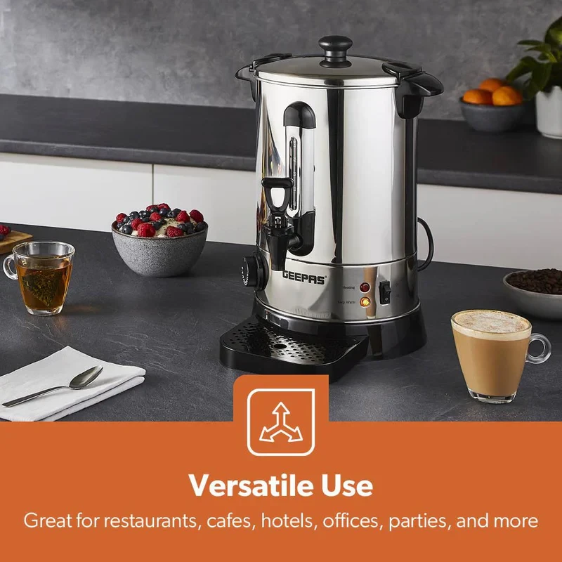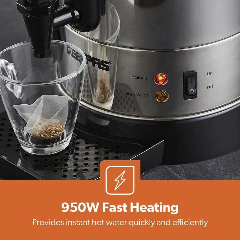 The Geepas GK6154 Stainless Steel Water Boiler is a dependable and efficient way to make and serve large amounts of hot water. It has a 6.8-litre capacity and a 1500W heating element that helps it boil water quickly and consistently, making it great for home, office, events, or business use. It's built with strong stainless steel, which means it's long-lasting and easy to clean. It also has safety features like boil-dry and overheat protection to keep you safe, along with an easy-to-use tap and cool-touch handles for safe and convenient operation.