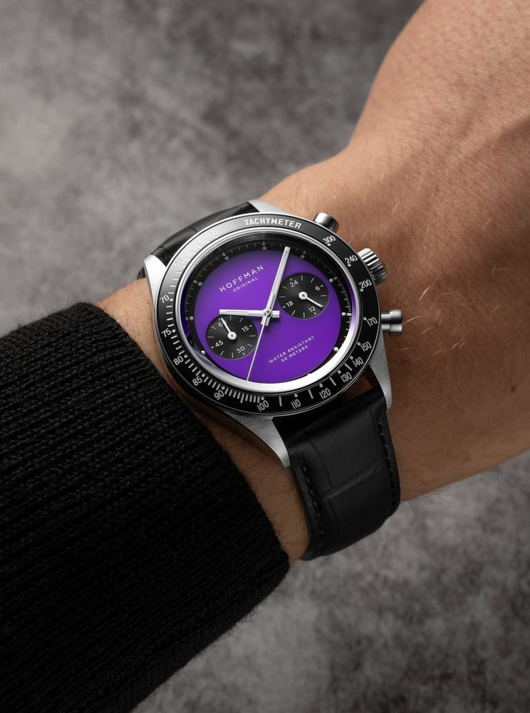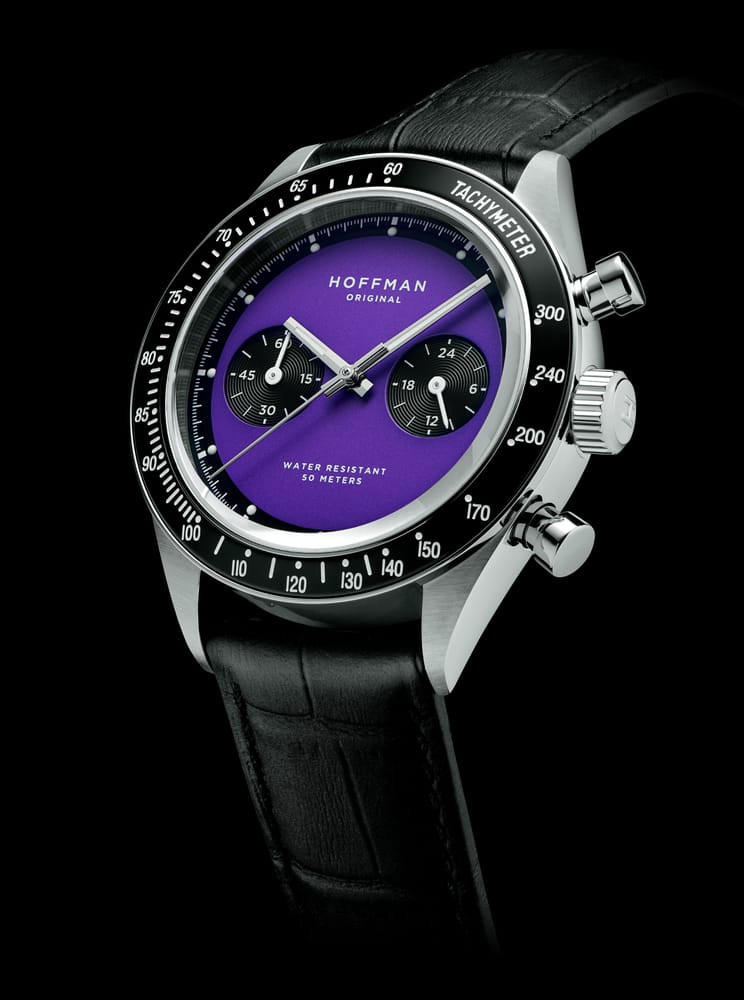The Hoffman Racing 40 "PRPL" Watch mixes a look inspired by racing with a refined, high-quality feel. It has a stainless steel case that's both polished and brushed, bright dial colors, and a reliable chronograph feature. This watch brings together a sporty and elegant style that appeals to people who love modern watches.