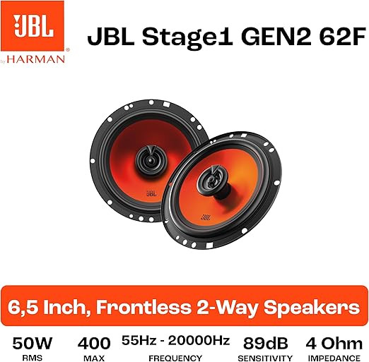 JBL Stage1 GEN2 62F 6.5 Inch (165mm) 2-Way Coaxial Car Speakers are designed to deliver clear, powerful sound with high efficiency, making them an ideal OEM replacement upgrade for factory car audio systems. Part of the JBL Stage1 GEN2 Series, these speakers offer strong bass, detailed midrange, and crisp highs with high sensitivity for louder output even with low-power head units. With a no-grille design and easy installation, the Stage1 62F provides reliable performance and improved audio clarity for everyday driving.