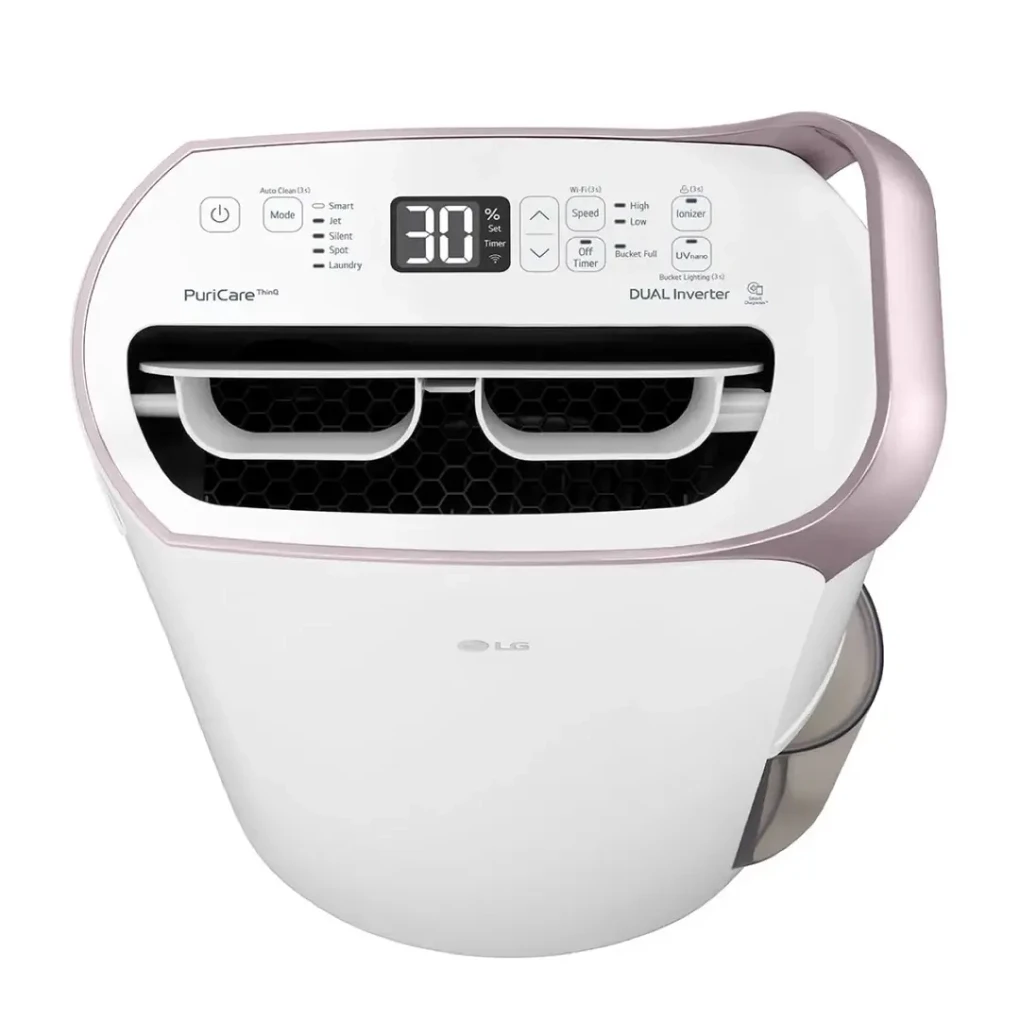 Enjoy a comfortable, moisture-free home with the LG MD19GQGE0 Dehumidifier. Designed with a Dual Inverter Compressor, it ensures powerful yet quiet dehumidification for any space. The advanced UV Nano and HEPA filter technologies purify and sanitize the air, removing bacteria, dust, and allergens. Its smart LG ThinQ control lets you monitor and adjust settings anytime, anywhere. Built for efficiency, convenience, and healthy living.