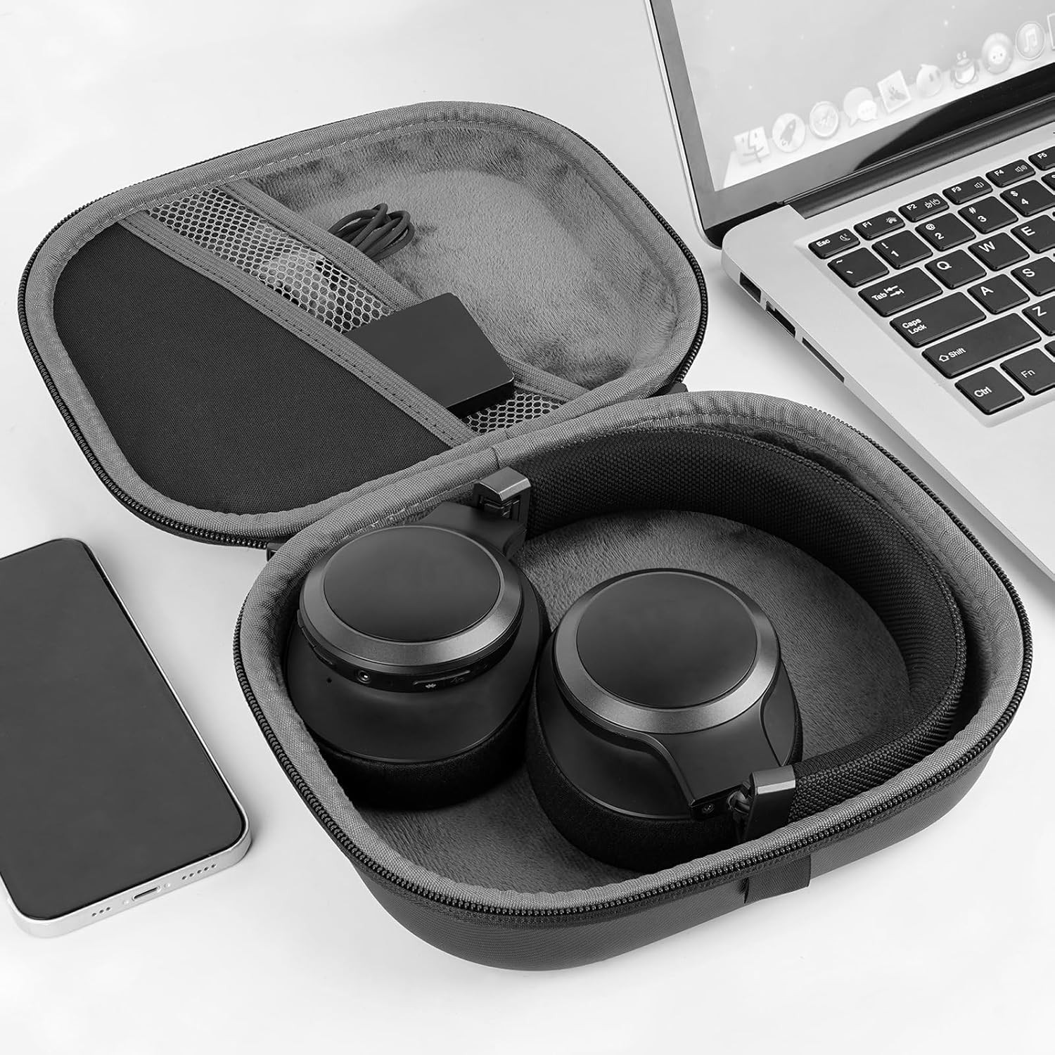 The interior mesh pocket keeps accessories like cables, chargers, earpads, and power banks securely in place.