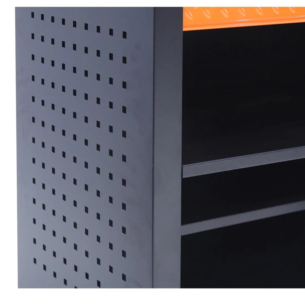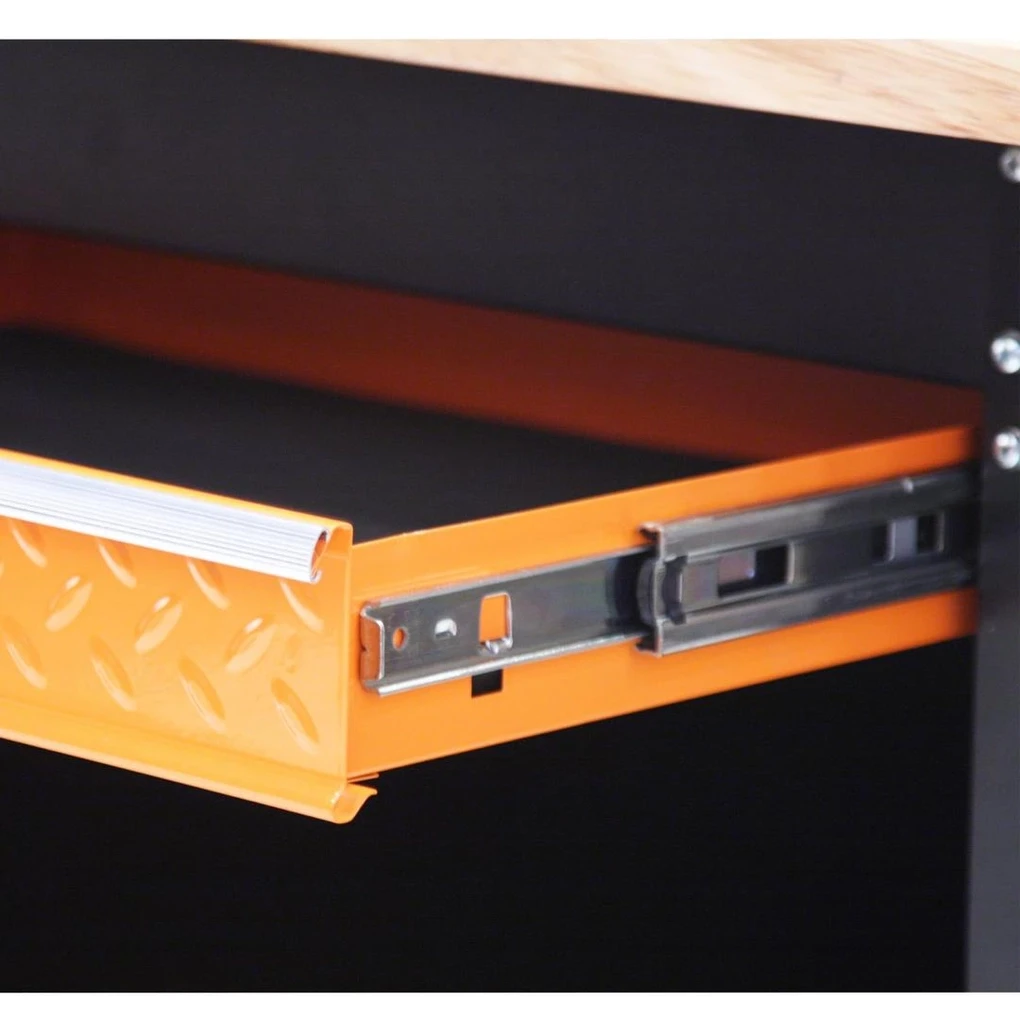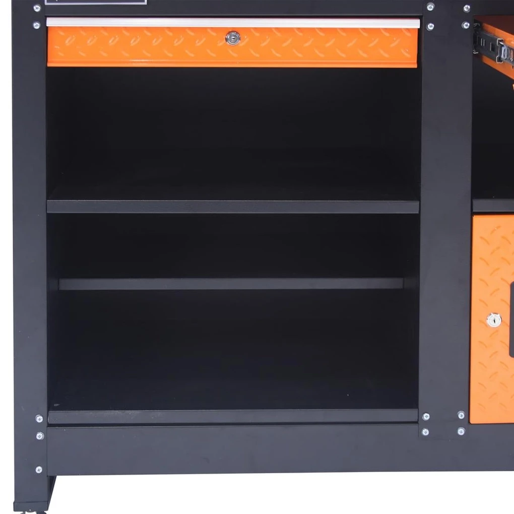 The bench includes multiple storage options — two small drawers (6 kg each), a single shelf (5 kg), and four spacious shelves (10 kg each) — allowing you to neatly organize your tools and accessories. The double ball bearing slides ensure smooth drawer operation, while the lockable drawers and cabinet keep your valuable tools safe and secure.