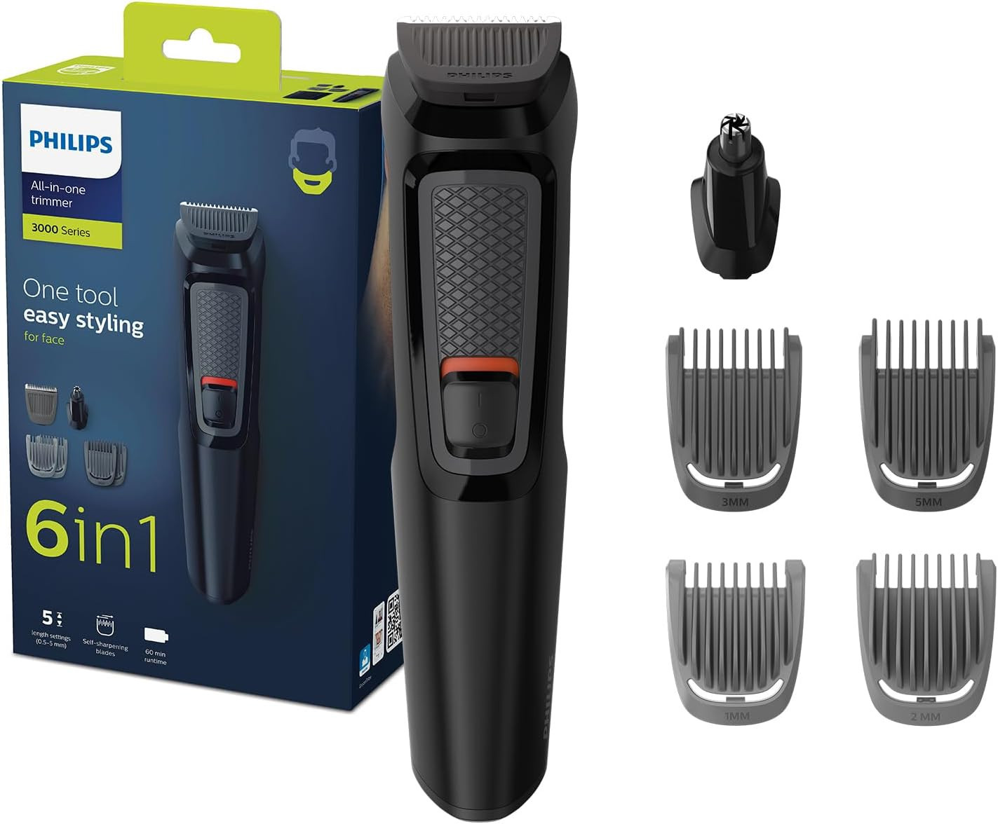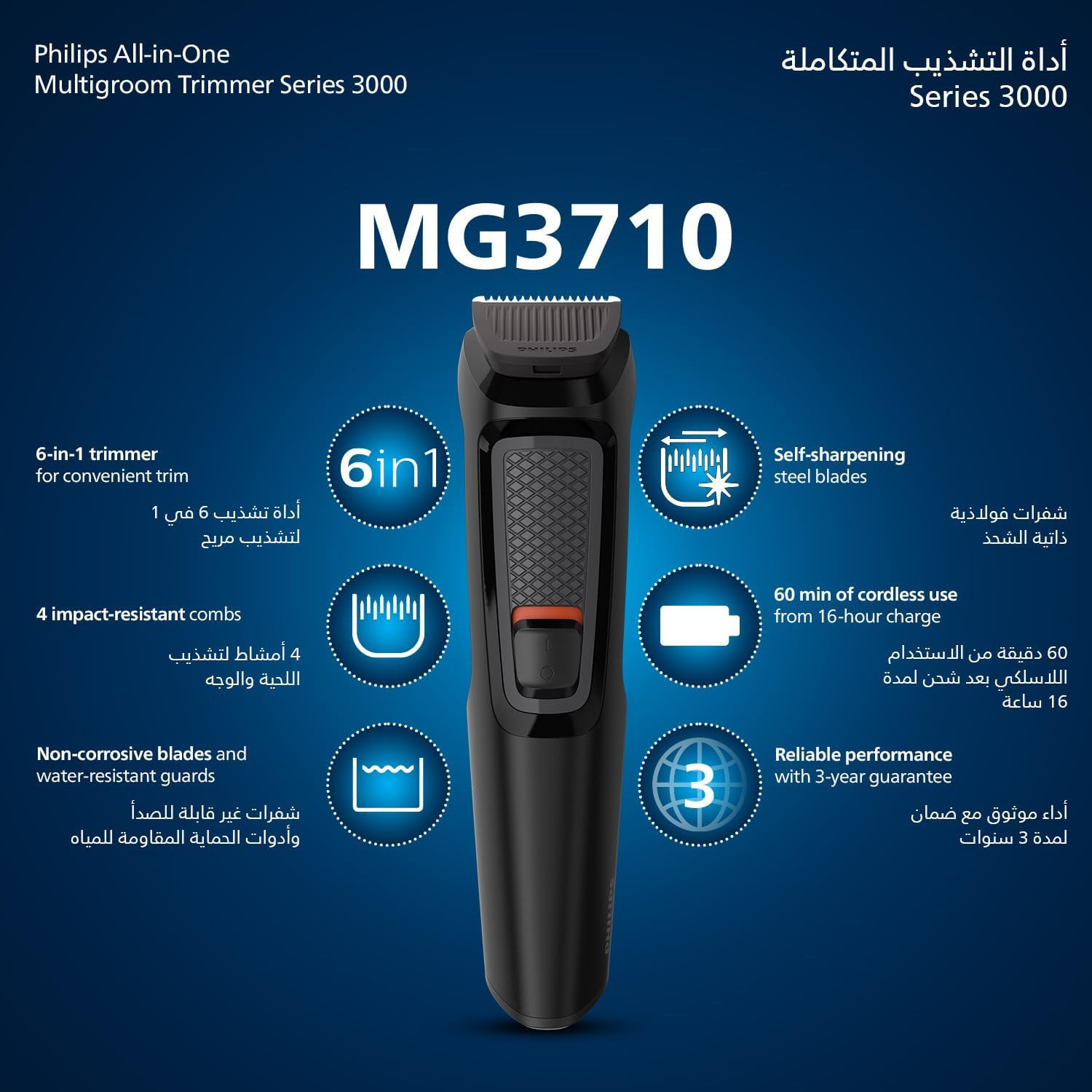 Redefine your grooming routine with the Philips Multigroom Series 3000 MG3710/33, a durable and versatile 6-in-1 all-in-one trimmer designed to help you create any look effortlessly. Equipped with self-sharpening, skin-friendly blades, it delivers consistent cutting performance while remaining gentle on the skin — perfect for trimming your beard, mustache, sideburns, and necklines with precision.