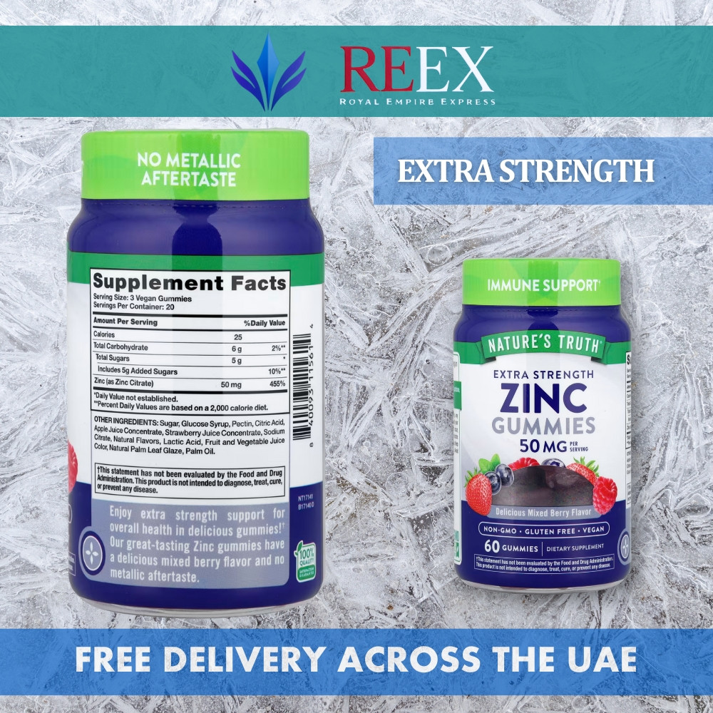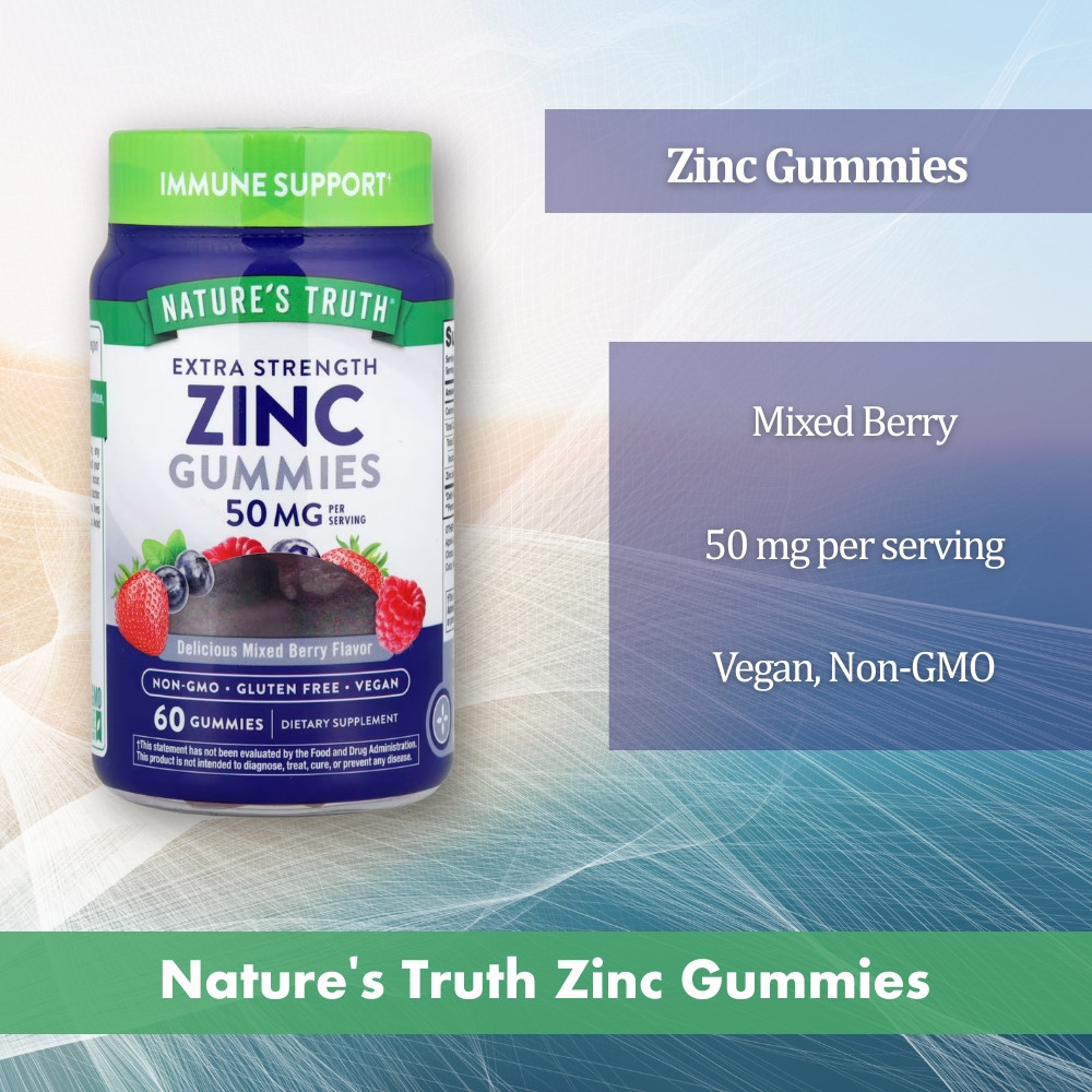 Nature’s Truth Zinc Gummies provide a delicious and convenient way to support daily immune health and overall wellness. Each serving delivers 50 mg of Zinc (as Zinc Citrate), contributing to immune function, antioxidant protection, and cellular health. Formulated as vegan, non-GMO gummies, they offer a natural mixed berry flavor without any metallic aftertaste, making it easy to incorporate Zinc into your daily routine.