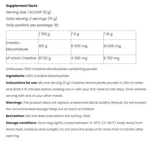 • Nutriversum Creatine Monohydrate – Pure Micronized Creatine for Peak Performance still, muscle size, and training intensity to the coming position, If you want to take your strength. This decoration, 100 pure micronized creatine monohydrate greasepaint is designed to support performance, abidance, and recovery during high- intensity exercises. Crucial Benefits 100 Pure Creatine Monohydrate – high- quality, micronized form for better immersion. Enhances Strength & Performance – improves power affair during short, repeated, high- intensity exercises. Unflavoured Formula – fluently mixes with water, juice, or your favorite shake. Allergen- Free & Sugar- Free – no gluten, lactose, or complements. Accessible Packaging – easy to measure, perfect for diurnal use. What Is Creatine Monohydrate? Creatine is a naturally being composite formed from amino acids and stored substantially in your muscles, with lower quantities set up in the liver, feathers, and brain. It plays a crucial part in energy product during short bursts of violent exertion similar as toning, sprinting, or HIIT exercises. Regular use of Creatine Monohydrate has been shown to Increase muscle strength and power affair Ameliorate training capacity and performance Support muscle growth and recovery Why Choose Nutriversum Creatine Monohydrate? Unlike numerous creatine products, this formula delivers only pure micronized creatine — no paddings, flavors, or sugars. The micronized form ensures optimal solubility and fast immersion, helping your body get the full benefit of this proven supplement. It’s perfect for Athletes and bodybuilders aiming to boost performance newcomers starting a strength or muscle- gain program Challengers in need of clean, cumulative-free creatine Anyone seeking a dependable, substantiation- grounded supplement for better results How to Use Mix 1 serving( approx. 3 – 5 g) with 200 – 300 ml of water or juice. Training days Take ahead or after your drill. Rest days Take formerly daily, rather with a mess. Tip For stylish results, use daily and stay well doused. constituents 100 Micronized Creatine Monohydrate( unflavoured). Free from gluten, lactose, sugar, and artificial complements. Scientific Note Creatine contributes to bettered physical performance during short, repeated, high- intensity exercise. The salutary effect is attained with a diurnal input of 3 grams of creatine. Who Is It For? Those looking to increase muscle strength and power individualities aiming to gain spare body mass Athletes seeking to enhance performance and recovery Anyone wanting to witness one of the most delved and effective supplements in sports nutrition Storage Keep tightly closed in a cool, dry place( 5 – 30 °C/ 41 – 86 °F). cover from heat and humidity. Warnings Food supplements should n't replace a varied and balanced diet. Do n't exceed the recommended diurnal cure. Keep out of reach of youthful children.
