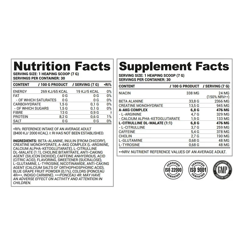 Contains A-AKG, Creatine, Beta-alanine, and Niacin