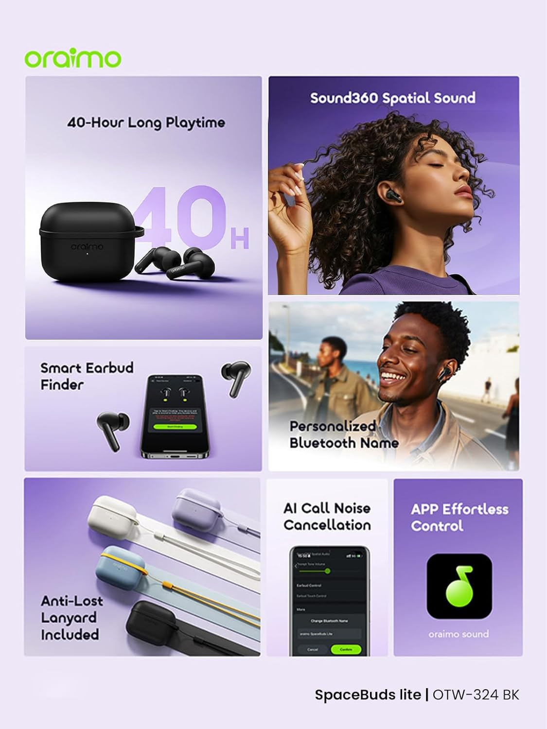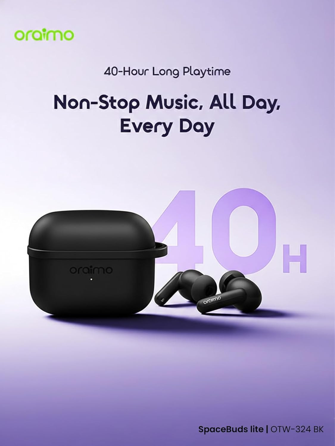 Elevate your listening experience with Oraimo OTW-324 SpaceBuds Lite True Wireless Earbuds. Engineered for comfort, performance, and convenience, these earbuds deliver immersive Sound360 spatial audio that brings music, calls, and videos to life. With 40-hour long playtime, quick charging, and a sleek Speed Black design, the SpaceBuds Lite are perfect for commuting, workouts, gaming, or everyday use. Enjoy a secure fit, advanced connectivity, and crystal-clear sound wherever you go.