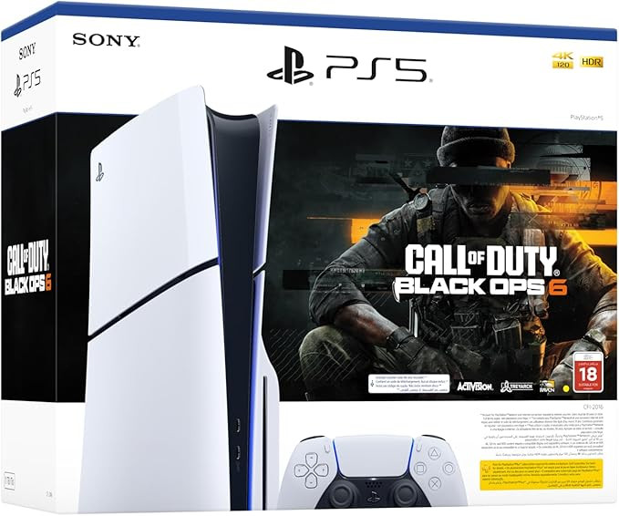 - PlayStation 5 Disc Slim Console with a modern, slim design- Call of Duty: Black Ops 6 game included in the bundle- Ultra-fast 1TB SSD for quick load times and smooth gameplay- Built-in Ultra HD Blu-ray disc drive for playing physical games and media- Supports up to 4K resolution for sharp and detailed visuals- DualSense wireless controller with haptic feedback and adaptive triggers- Ray tracing for realistic lighting and reflections- Tempest 3D AudioTech for an immersive in-game sound experience- Backward compatibility with most PS4 gamesSpecifications:- Model: PlayStation 5 Disc Slim Console- Bundle: Call of Duty: Black Ops 6- Version: UAE- Storage Capacity: 1TB SSD- Maximum Resolution: Up to 4K- Processor: AMD Ryzen Zen 2- Graphics Processor: AMD RDNA 2-based GPU- Disc Drive: Ultra HD Blu-ray- Ray Tracing: Supported- Audio Technology: Tempest 3D AudioTech- Connectivity: HDMI, USB-A, USB-C, Wi-Fi, Bluetooth- Controller: DualSense Wireless ControllerUsage:- Perfect for home gaming and entertainment- Ideal for playing both physical and digital PS5 and PS4 games- Supports online multiplayer gaming through the PlayStation Network- Works well with 4K TVs and monitors for smooth, detailed gameplay- Also great for watching Blu-ray movies and using streaming apps