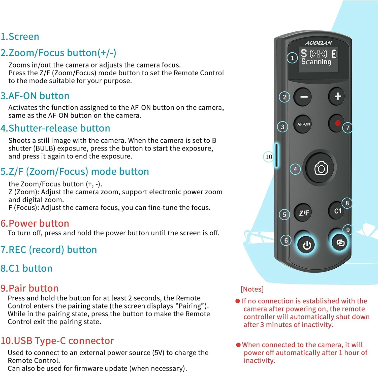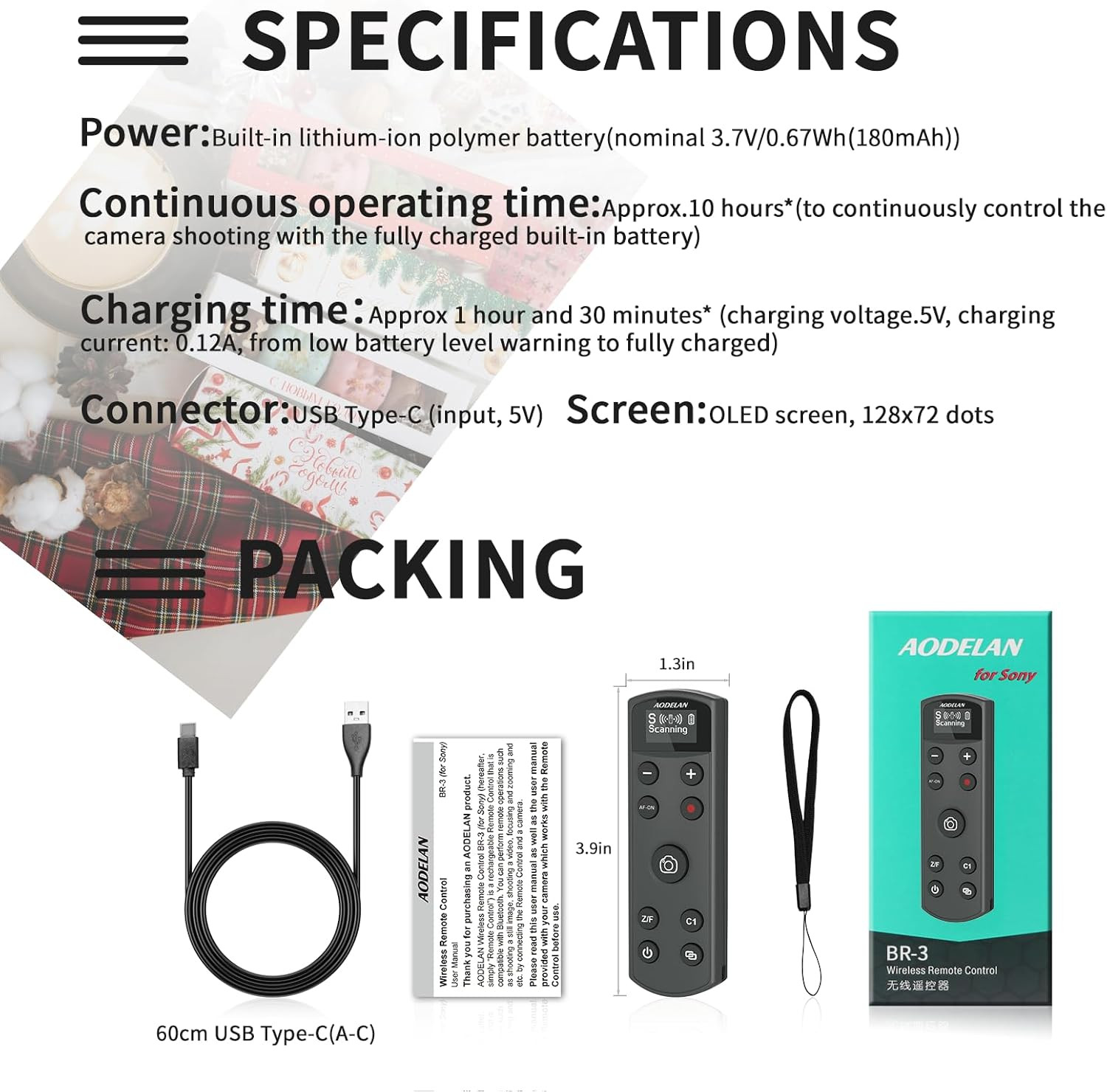 The AODELAN BR‑3 Wireless Remote Shutter Release for Sony Cameras is a versatile Bluetooth remote controller designed for photographers and videographers using Sony cameras. With wireless operation, rechargeable battery, and a built-in digital display, it provides convenient remote control for capturing photos, recording videos, and adjusting focus or zoom from a distance.