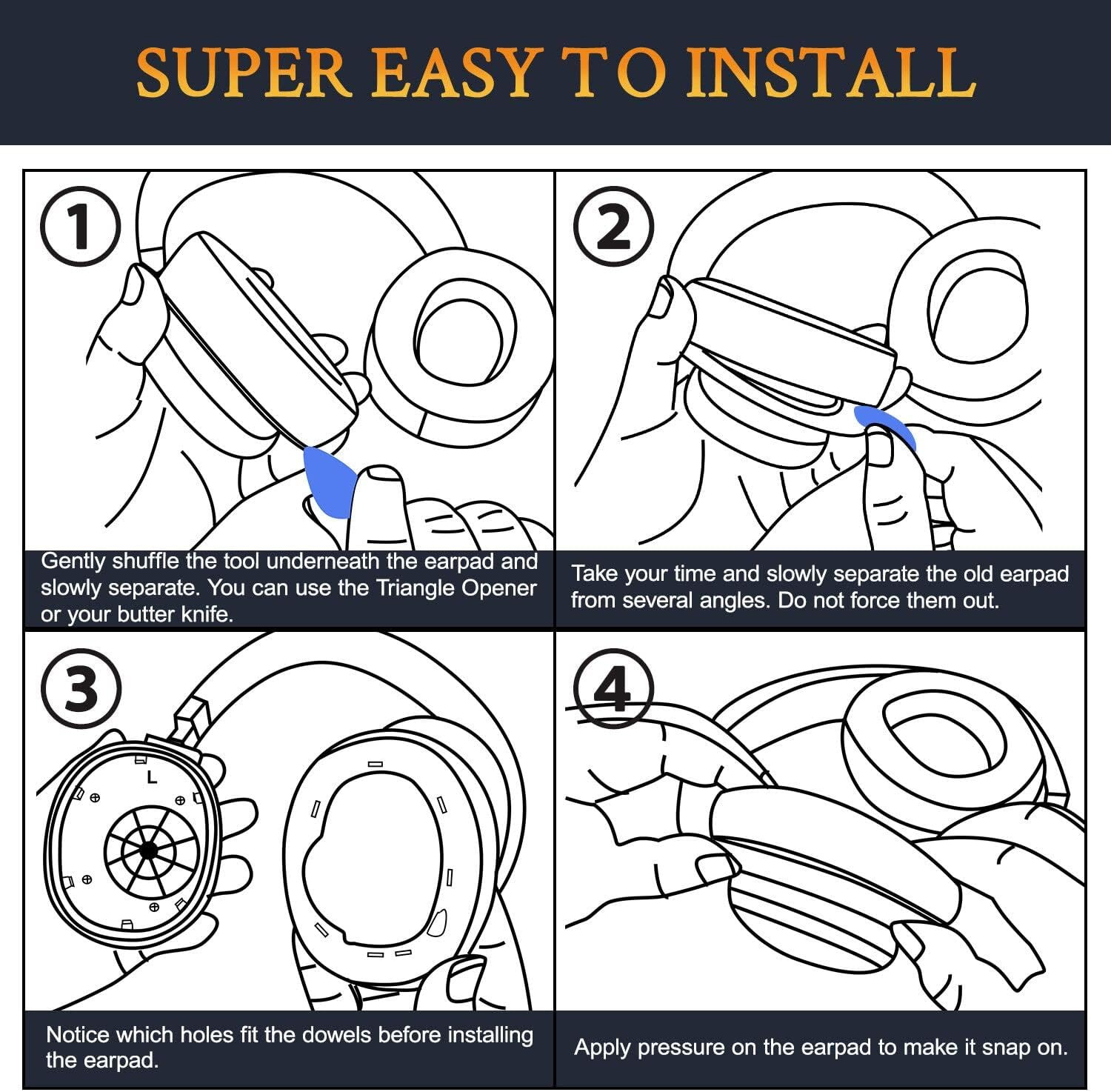 Installation is quick and simple — just remove your old pads, align the new ones with the headphone cup slots, and snap them securely into place. A removal tool is included for added ease and precision.