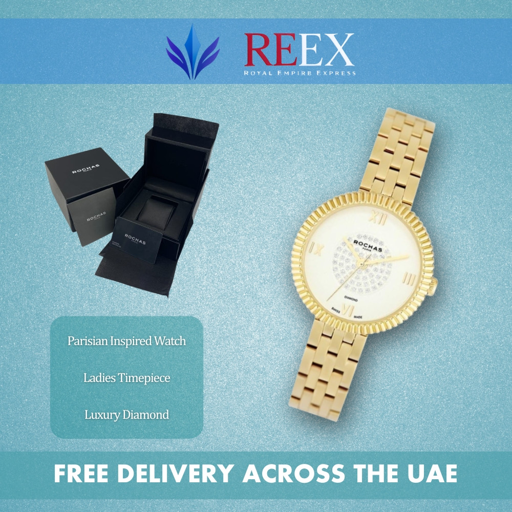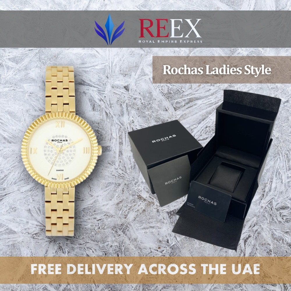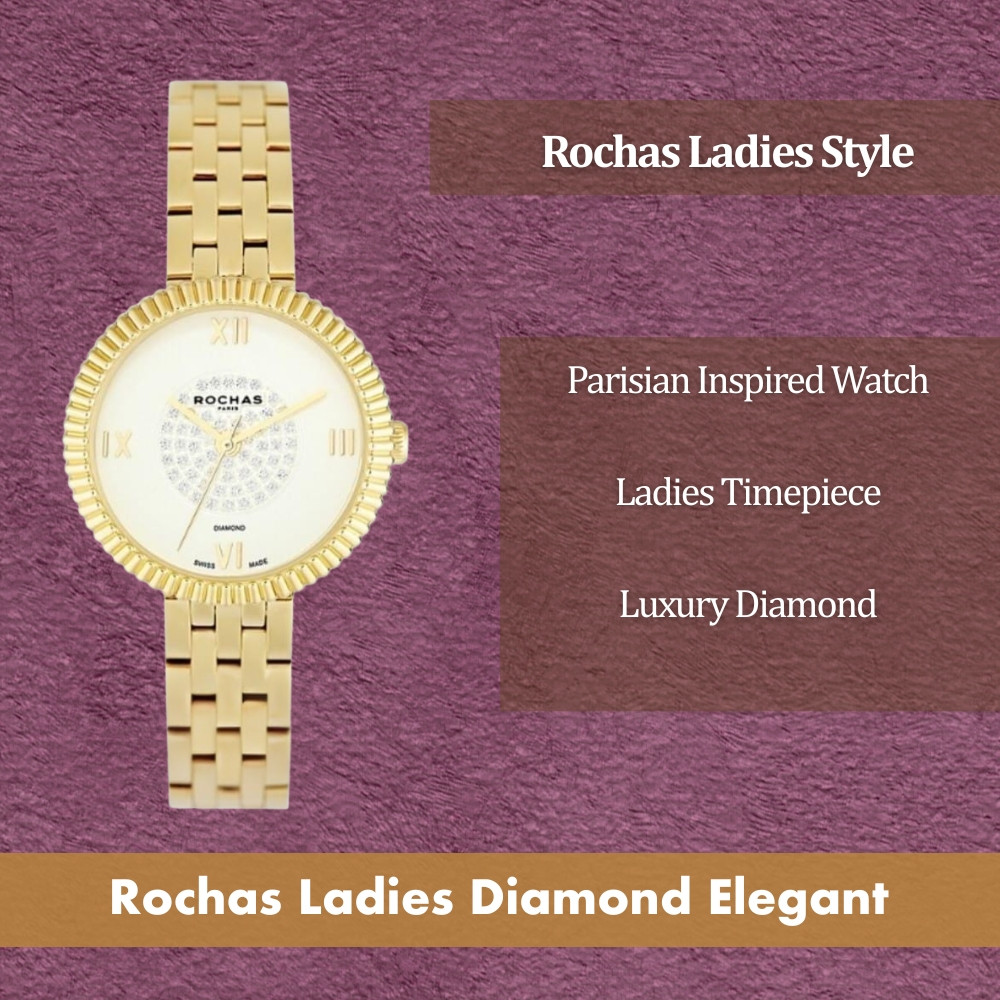 The Rochas Ladies Diamond Watch is a beautiful and elegant piece that shows grace, style, and accuracy. It's made for the modern woman and has a shiny case with sparkling diamonds that add a refined touch to any look. Made from high-quality materials and with a precise quartz movement, it combines classic Parisian elegance with everyday use. This watch is great for both special events and regular wear, and it shows Rochas' signature charm and fine workmanship.