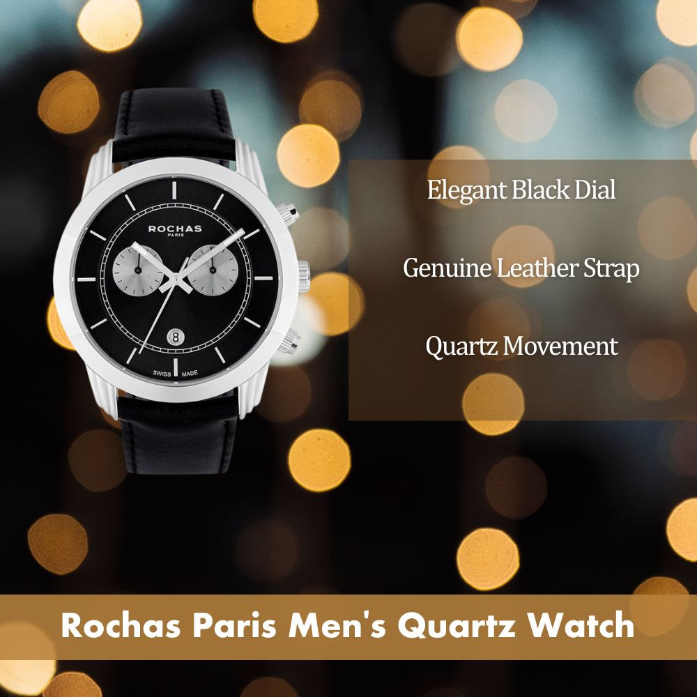 The Rochas Paris Men's Quartz Watch reflects timeless French elegance with modern sophistication. Designed with a sleek black dial and a soft genuine leather strap, this timepiece combines refined style with everyday practicality.
