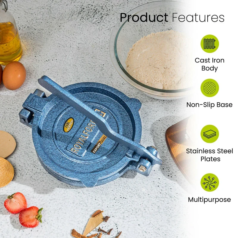 The Royalford RF10407 Chapati Press is a strong and effective tool that helps you make round and flat chapatis, pooris, and tortillas with little effort. Made from heavy cast iron and a durable stainless steel plate, it gives long-lasting performance and even pressure for consistent results. The handle is easy to grip for comfortable use, and the non-slip base keeps the press steady while you work. Perfect for daily cooking, this chapati press brings together traditional design with modern features to make meal preparation faster, easier, and less messy.