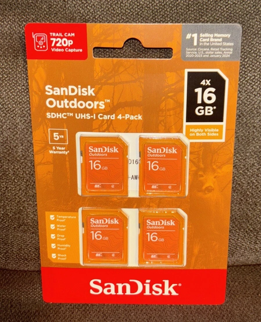 The SanDisk Outdoors SD UHS-I Card 16GB (4-Pack) is designed for adventurers, photographers, and outdoor enthusiasts who need reliable storage in rugged conditions. With 16GB per card and four cards included, this pack provides flexible and dependable storage for cameras, drones, and other SD-compatible devices.