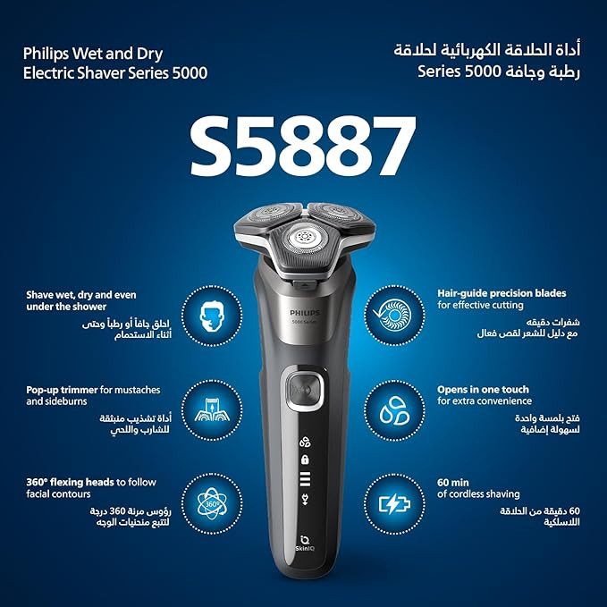 The Philips Series 5000 S5887/10 delivers a powerful, close shave while prioritizing skin comfort. Equipped with advanced SkinIQ technology, the shaver intelligently senses and adapts to your hair density, providing a smooth and effortless grooming experience.