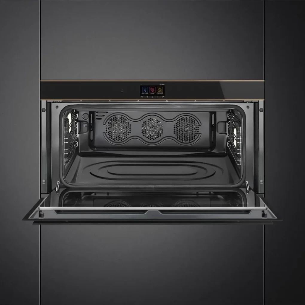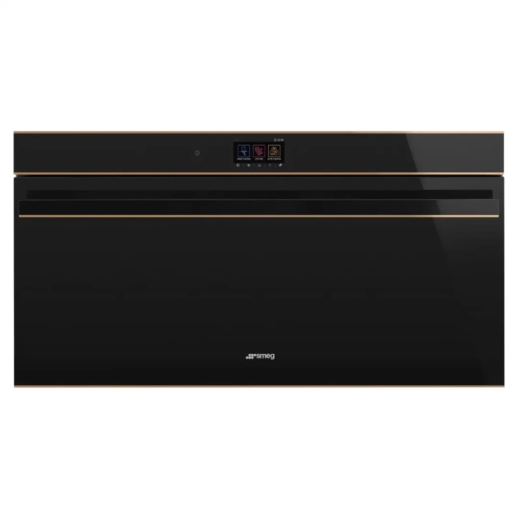 Elevate your kitchen with the SMEG Dolce Stil Novo Built-In Thermo-Ventilated Oven, designed for high performance and modern elegance. Its 85-liter capacity accommodates large meals for families and gatherings. The thermo-ventilated system ensures even heat distribution for perfect cooking results. A user-friendly VivoScreen touch display offers 10 cooking functions, 48 automatic programs, and smart multi-step cooking options. Pyrolytic cleaning keeps the oven interior spotless, while versatile features like microwave functionality, customizable recipes, and energy efficiency make it ideal for every culinary task.
