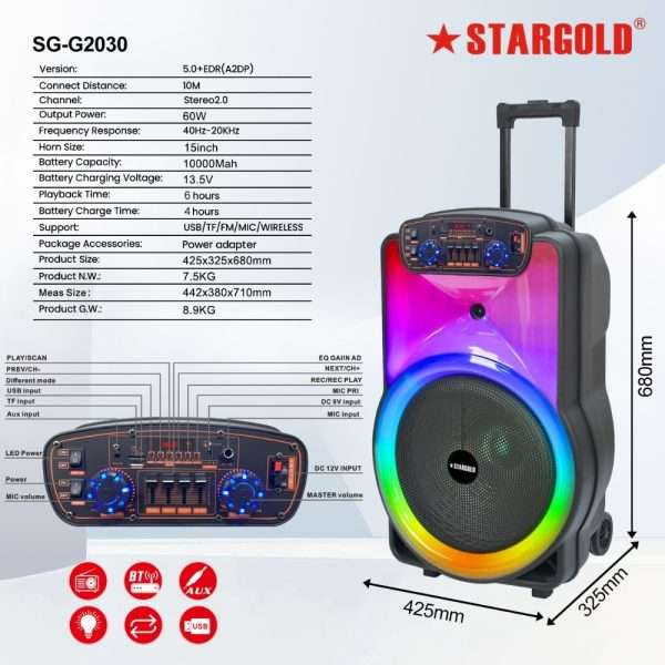 The STARGOLD Multimedia Speaker SG-G2030 BLACK brings you a superior home theater experience with exceptional sound clarity and deep bass. Designed with a stylish hard plastic body, this durable and elegant speaker blends perfectly with any home setup. With support for Bluetooth, USB, SD/MMC, and AUX, it ensures seamless connectivity for all your entertainment needs. Whether you’re hosting parties, watching movies, or enjoying karaoke nights, the SG-G2030 delivers powerful sound performance with convenient controls and user-friendly features.