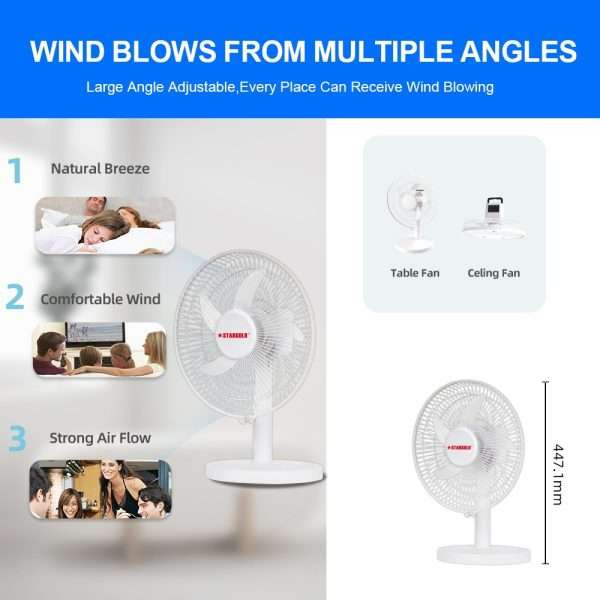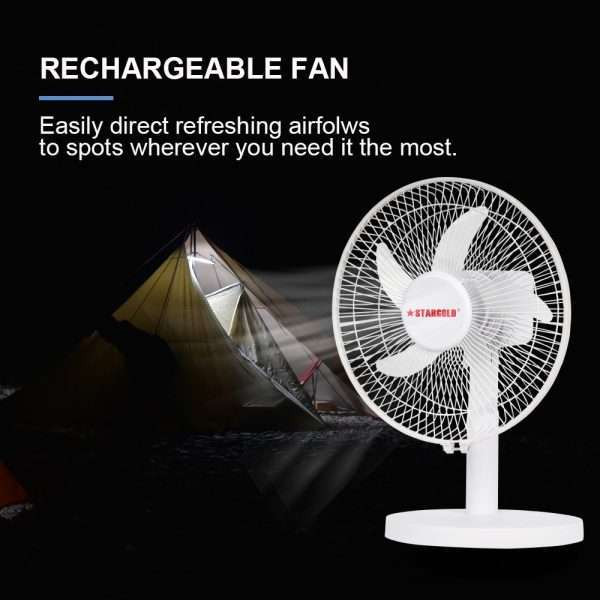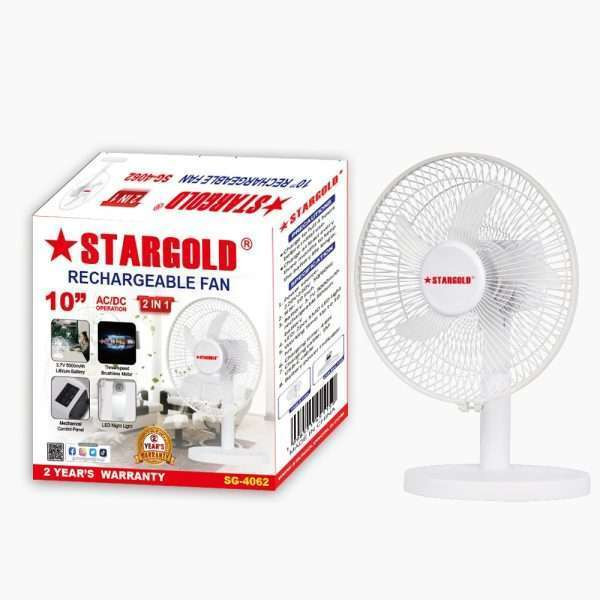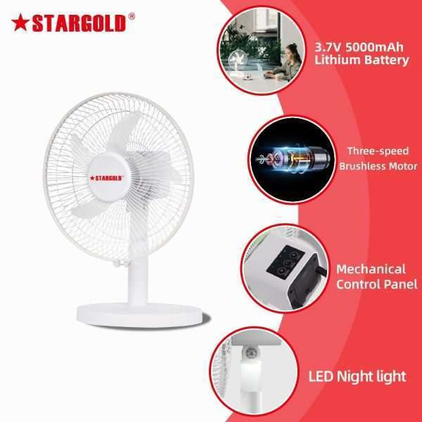 Beat the heat with the STARGOLD SG-4062 White Portable 10-Inch Rechargeable Table Fan. Compact, quiet, and versatile, this fan is designed for home, office, or outdoor use. Its rechargeable 5000mAh lithium battery provides up to 7 hours of continuous airflow, ensuring comfort anytime, anywhere.