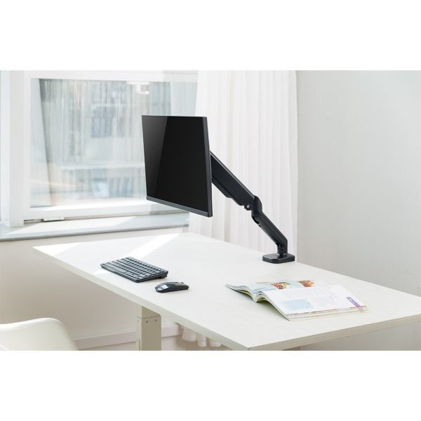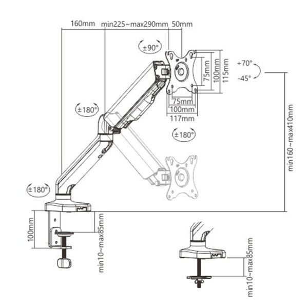 Compatible with VESA 75×75 and 100×100 mm, this mount fits most LCD, LED, and Plasma screens. Designed with adjustable desktop thickness support (10mm–85mm), it fits a wide variety of desk types using either clamp or grommet installation.