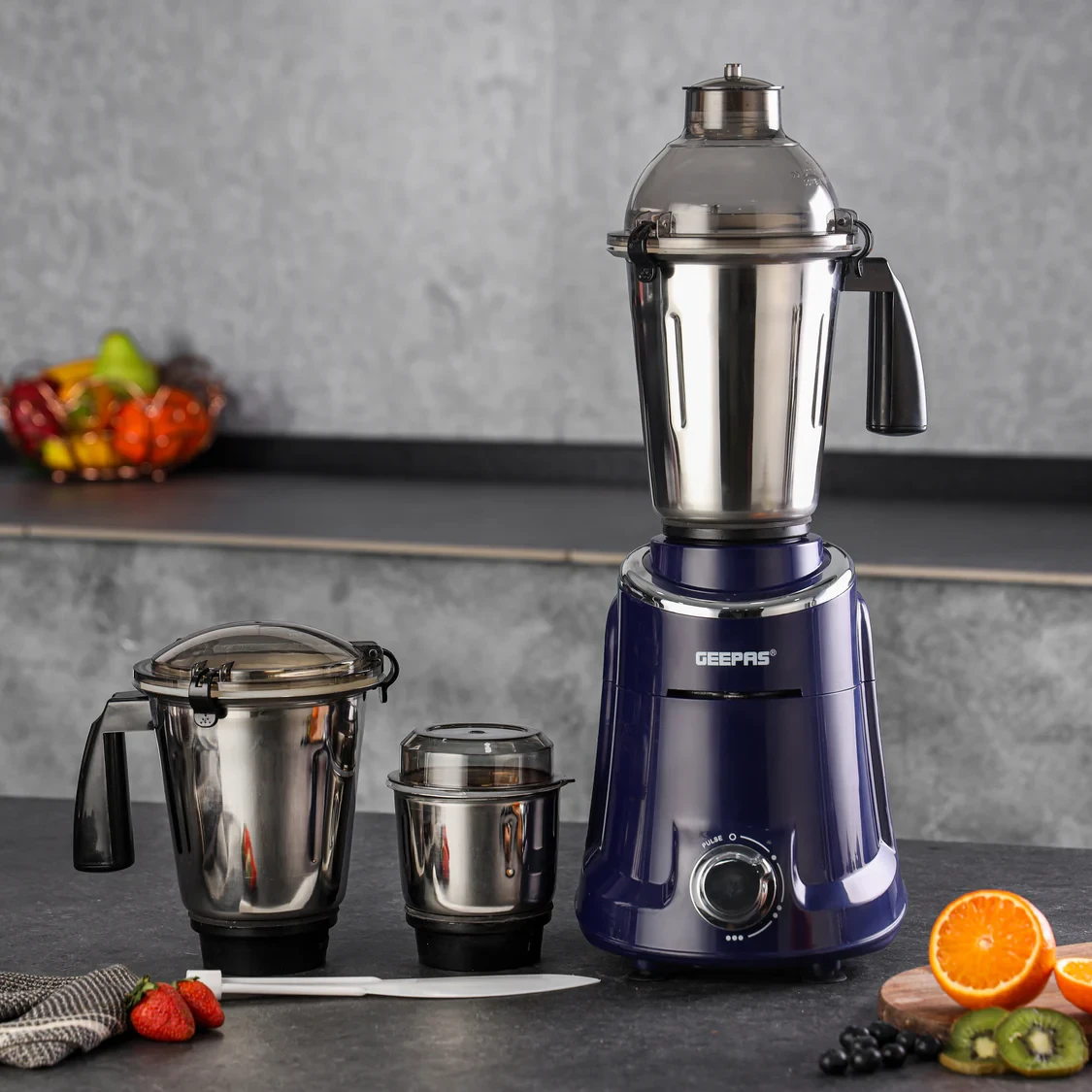 The Geepas 3-in-1 Mixer Grinder GSB5080S is designed to make food preparation quick and efficient. It features a 750W strong motor that makes grinding, blending, and mixing tasks easy and smooth. The appliance comes with three stainless steel jars and sharp blades that ensure long-lasting durability and precise results. The 3-speed control along with a pulse function allows users to achieve different textures with ease. The unbreakable jar caps make the unit robust and suitable for everyday use. This mixer grinder is perfect for daily cooking and offers convenience, strong performance, and reliable results every time.