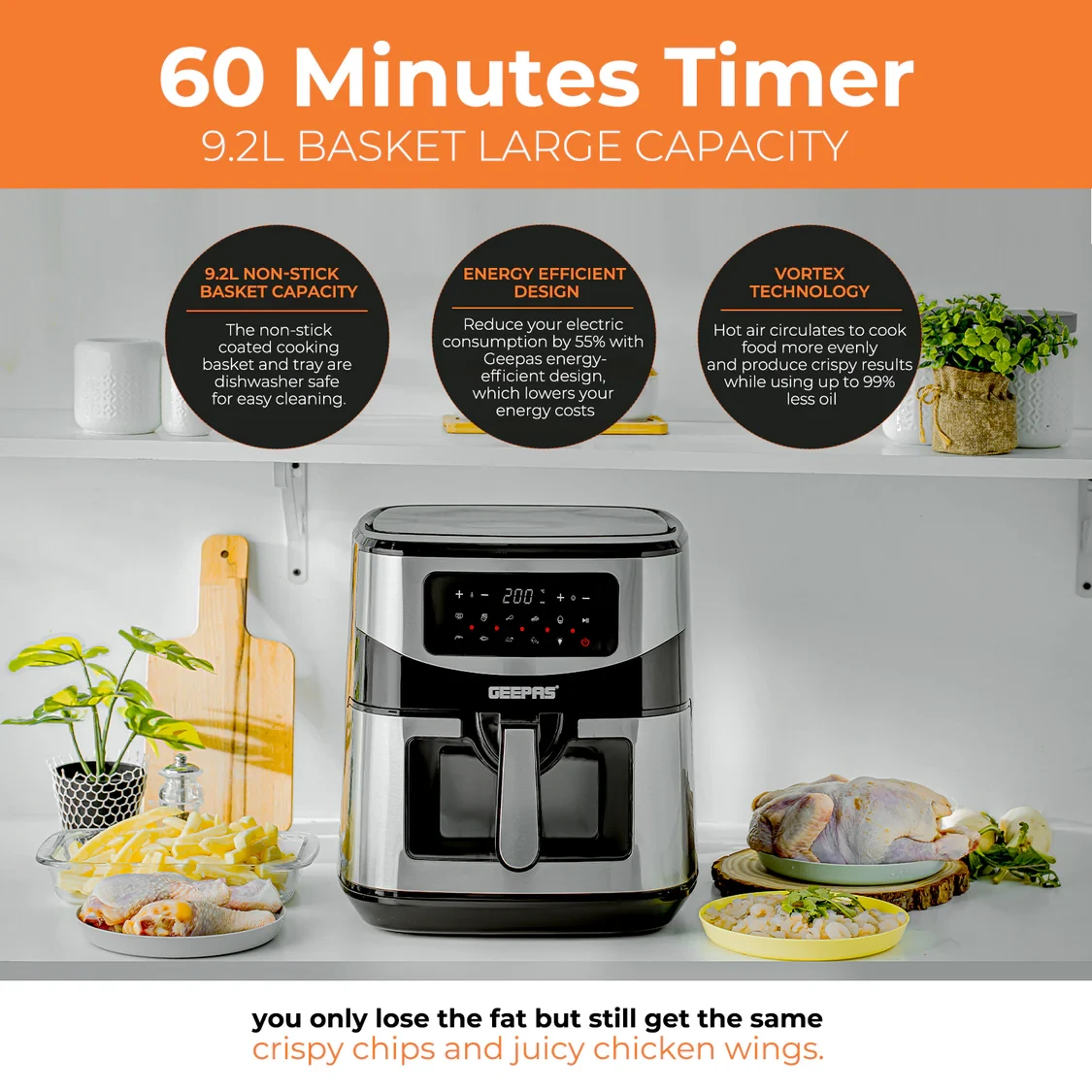 Cook tasty and healthy meals for your whole family with the Geepas Digital Air Fryer GAF37524UK. It has a big 9.2L capacity, perfect for feeding a large group, and uses advanced Vortex Air Frying Technology for quick, even, and oil-free cooking. The LED touchscreen makes it easy to use, with 9 preset cooking modes that let you fry, grill, roast, bake, or reheat with ease. You can adjust the temperature between 80°C and 200°C and set a timer from 1 to 60 minutes, ensuring every meal comes out crispy and tender. This air fryer combines strength, size, and good looks, making it a great choice for families who want to cook healthy and conveniently.