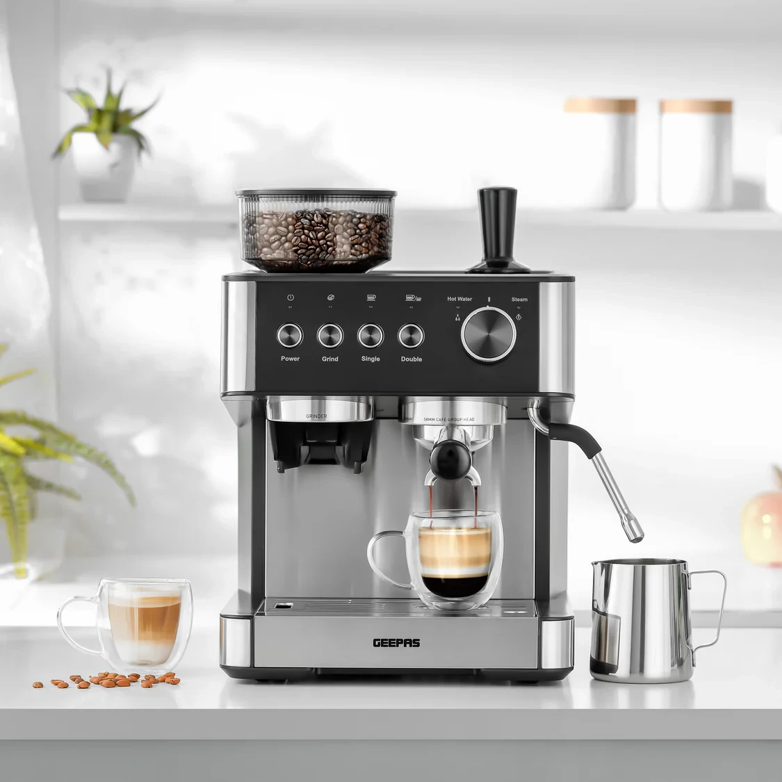 The Geepas GCMG1325S Espresso & Cappuccino Coffee Machine from the A43 Platinum Series is a top-quality all-in-one coffee maker for coffee enthusiasts. It features a strong 20 Bar high-pressure pump that extracts the best flavor and aroma, giving you a rich and genuine espresso taste. The machine comes with an inbuilt coffee grinder that allows you to grind fresh beans right away, which improves the taste and freshness of your coffee. The adjustable frothing steam wand helps you make creamy milk foam, perfect for cappuccinos, lattes, and mochas. The dual filter system lets you make both single and double shots, and the stainless steel build ensures the machine is durable and looks stylish. This coffee maker is designed to offer both performance and a sleek appearance, so you can enjoy café-style coffee right in your home.