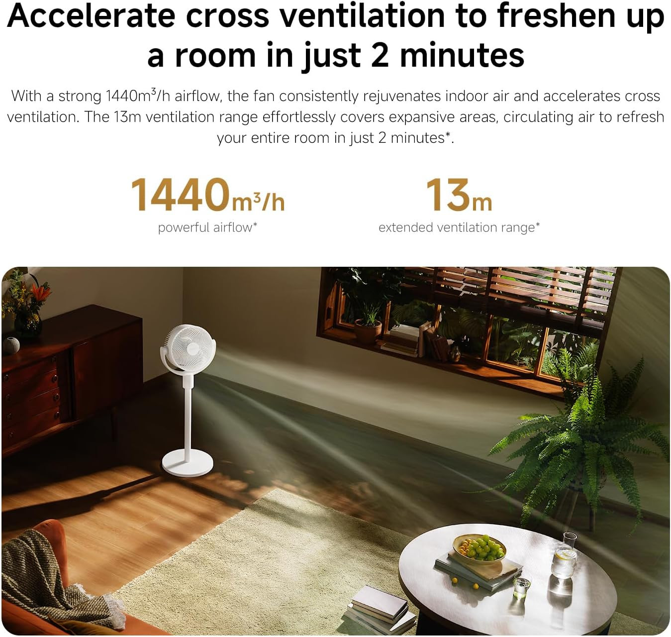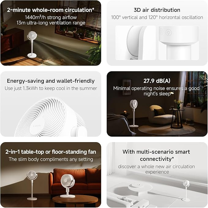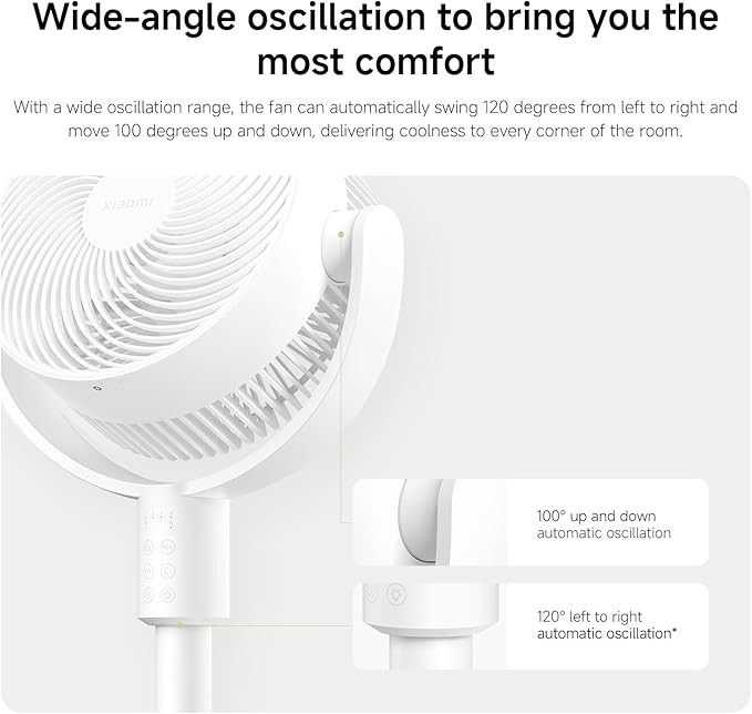 The Xiaomi Smart Standing Air Circulation Fan is designed to deliver stable and evenly distributed airflow for everyday indoor use. It provides an airflow capacity of up to 1440 cubic meters per hour with an effective range of up to 13 meters, helping circulate air efficiently across bedrooms, living rooms, or workspaces. The fan supports wide angle oscillation with up to 100 degrees vertical and 120 degrees horizontal movement, enabling three dimensional air distribution throughout the room.
