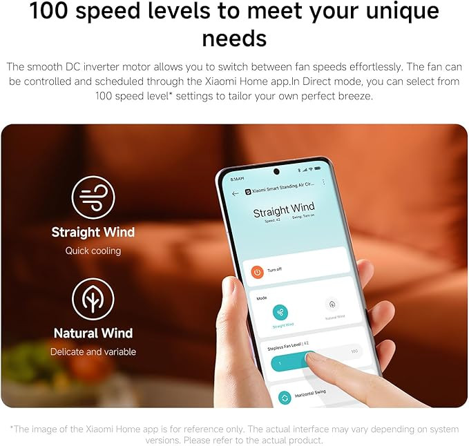 This model features 100 adjustable speed levels, allowing fine control over airflow intensity according to personal comfort preferences. With a low operating noise level of 27.9 decibels, it is suitable for quiet environments such as sleeping or working areas. The 2 in 1 design allows the fan to be configured for both desktop and floor standing use, offering flexible placement options based on room layout and usage needs.