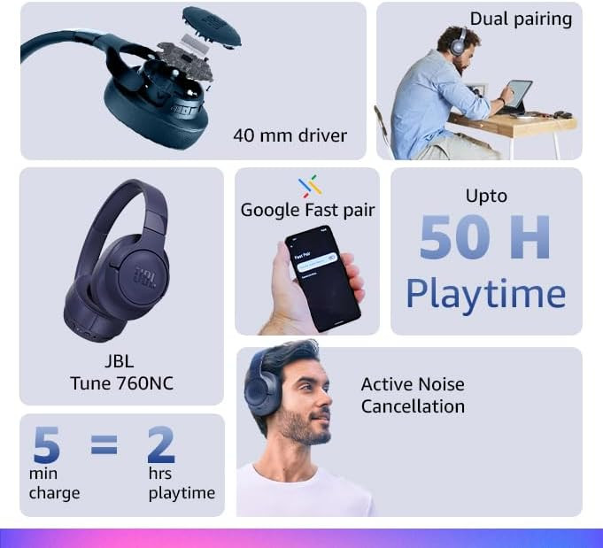 Audio Feature: Active Noise Cancelling, JBL Pure Bass Sound, Multi-Point Connection
