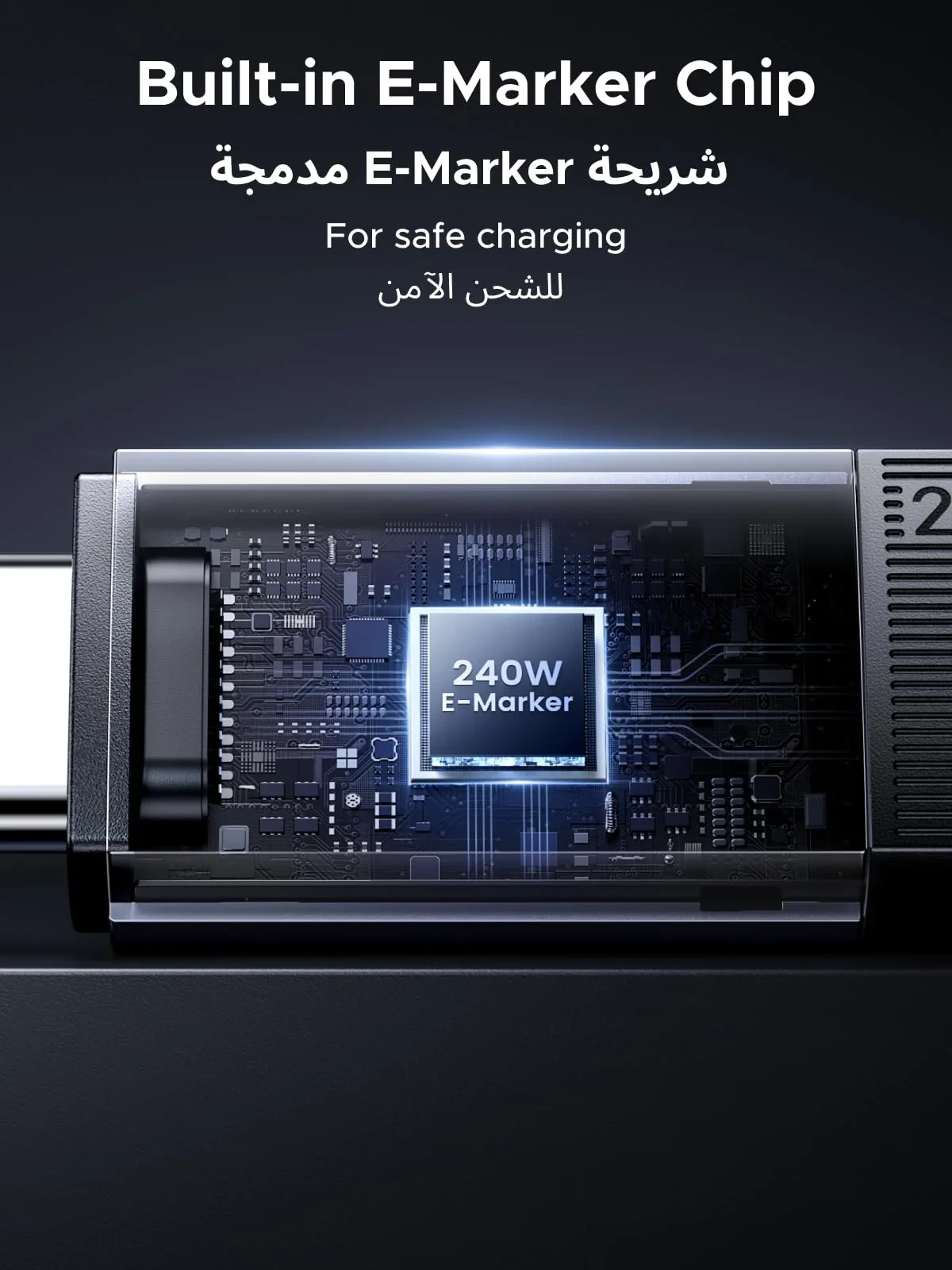 Built with nylon-braided exterior and reinforced with 56kΩ resistors. Includes an E-Marker smart chip to match required current and protect devices from overcurrent, overvoltage, and overheating. Tested for 10,000+ bends for long-lasting performance.