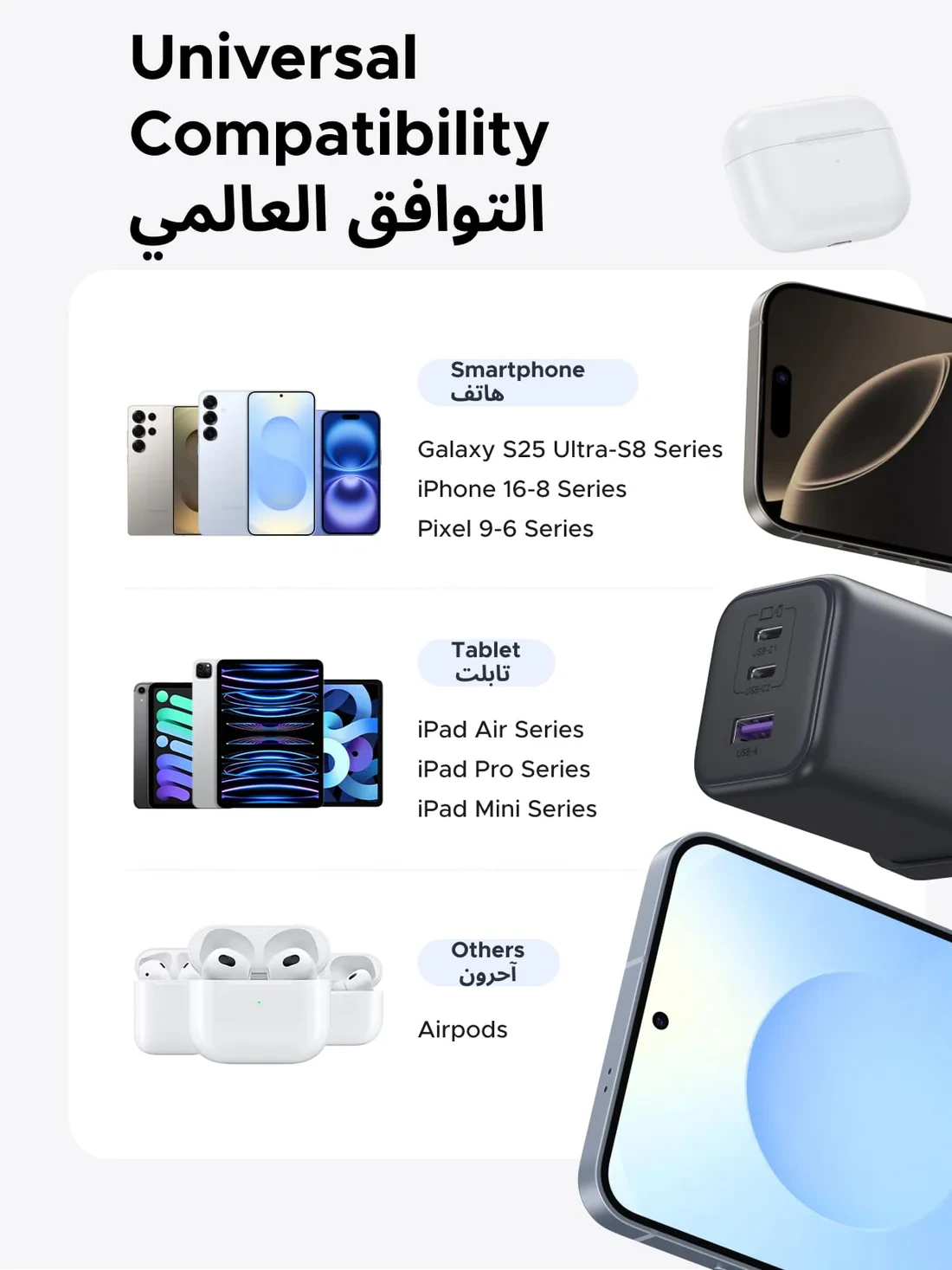 With two USB-C ports supporting up to 45W and a 22.5W USB-A port, this 3-in-1 charger allows simultaneous fast charging for smartphones, tablets, laptops, and accessories. It supports devices like iPhone 17/16 series, Galaxy S25/S24/S23, iPad Pro/Air/mini, MacBook Air, AirPods, Pixel 9/8/7, and more, making it a versatile charging solution for tech-savvy users.
