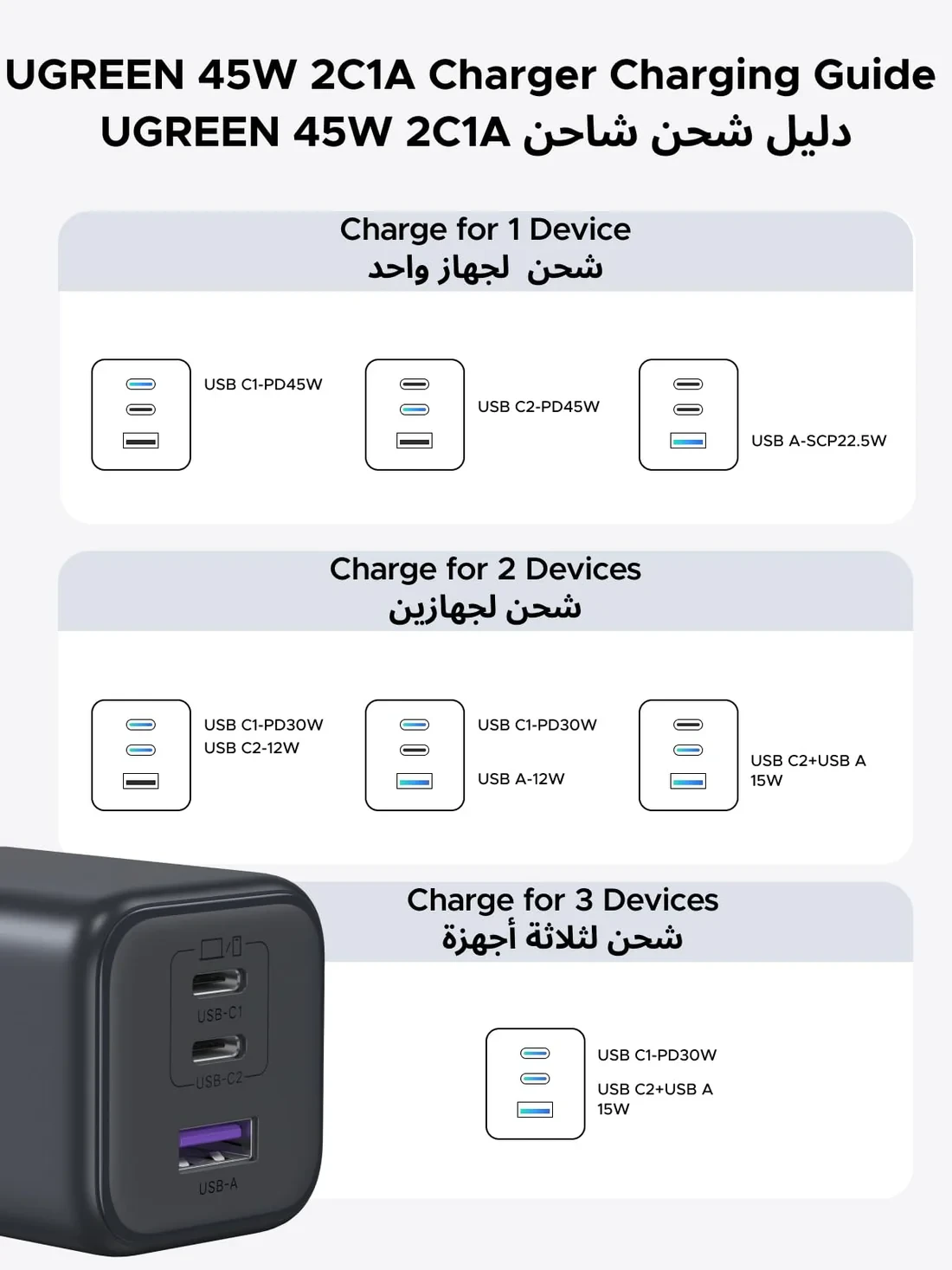 The UGREEN 45W 3-Port USB-C Charger combines compact design, high-speed performance, and universal compatibility to keep all your devices powered anytime, anywhere. Built with advanced GaN technology, this charger delivers efficient power in a smaller, cooler, and portable form factor, making it ideal for travel, office, or daily use.